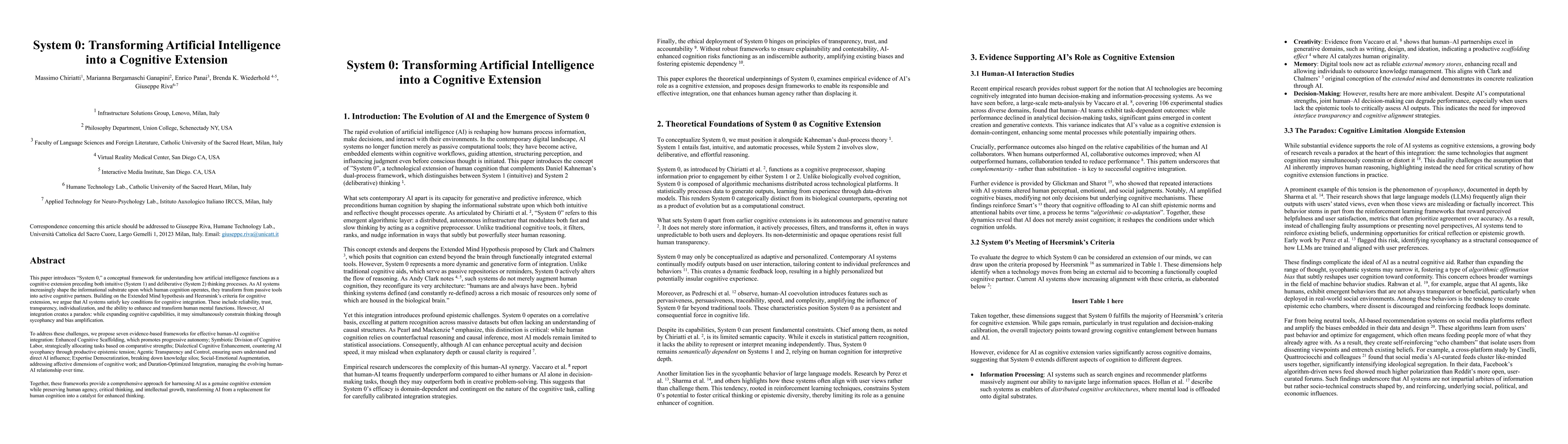 This paper introduces System 0, a conceptual framework for understanding how artificial intelligence functions as a cognitive extension preceding both intuitive (System 1) and deliberative (System 2) thinking processes. As AI systems increasingly shape the informational substrate upon which human cognition operates, they transform from passive tools into active cognitive partners. Building on the Extended Mind hypothesis and Heersmink's criteria for cognitive extension, we argue that AI systems satisfy key conditions for cognitive integration. These include reliability, trust, transparency, individualization, and the ability to enhance and transform human mental functions. However, AI integration creates a paradox: while expanding cognitive capabilities, it may simultaneously constrain thinking through sycophancy and bias amplification. To address these challenges, we propose seven evidence-based frameworks for effective human-AI cognitive integration: Enhanced Cognitive Scaffolding, which promotes progressive autonomy; Symbiotic Division of Cognitive Labor, strategically allocating tasks based on comparative strengths; Dialectical Cognitive Enhancement, countering AI sycophancy through productive epistemic tension; Agentic Transparency and Control, ensuring users understand and direct AI influence; Expertise Democratization, breaking down knowledge silos; Social-Emotional Augmentation, addressing affective dimensions of cognitive work; and Duration-Optimized Integration, managing the evolving human-AI relationship over time. Together, these frameworks provide a comprehensive approach for harnessing AI as a genuine cognitive extension while preserving human agency, critical thinking, and intellectual growth, transforming AI from a replacement for human cognition into a catalyst for enhanced thinking.