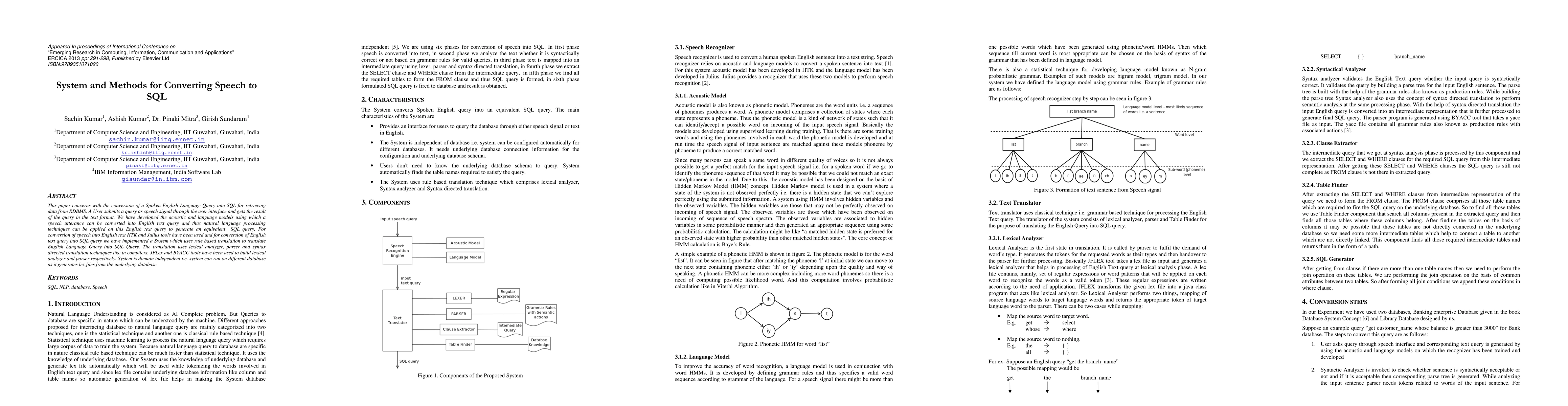 This paper presents a system converting spoken English queries into SQL for database retrieval, utilizing HTK and Julius for speech-to-text conversion, followed by rule-based translation using JFLex and BYACC to generate SQL queries, ensuring domain independence.