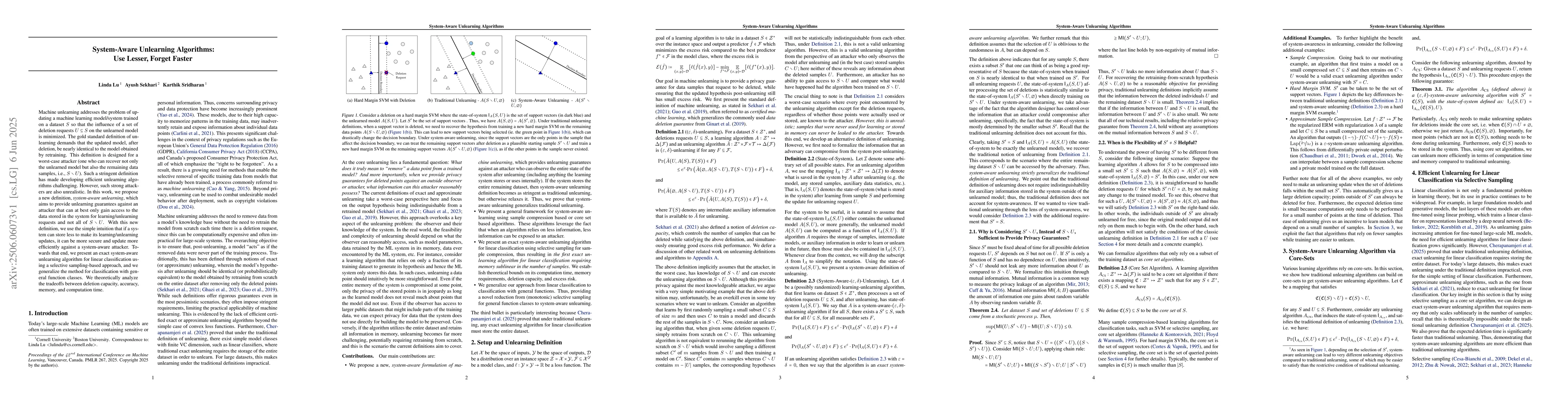 Researchers propose a new approach to machine unlearning called system-aware unlearning, which aims to minimize data deletion while maintaining model accuracy, and develop an efficient algorithm for linear classification using selective sampling.