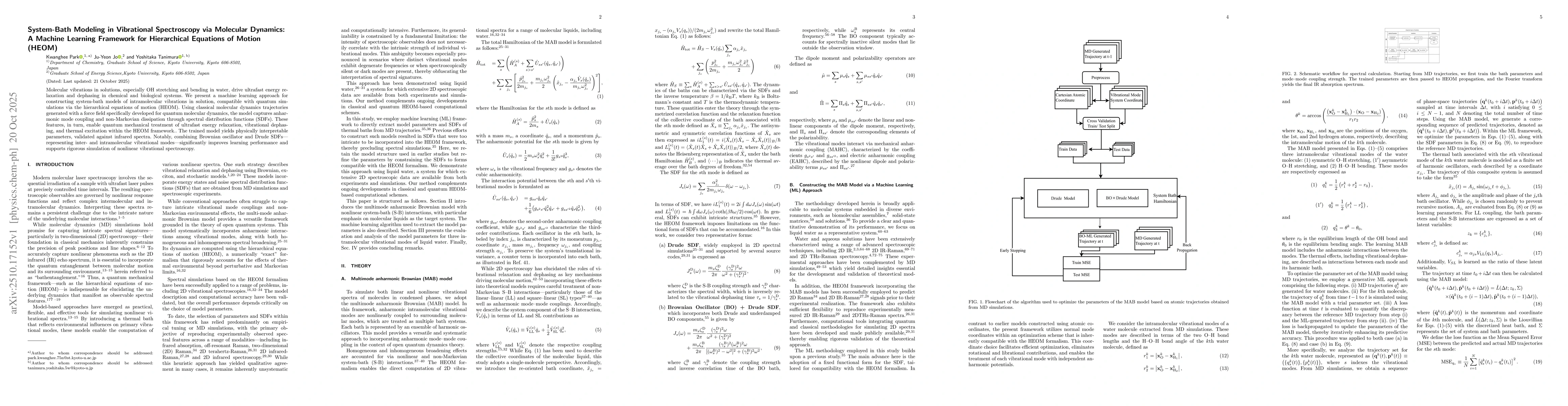 The study combines machine learning with quantum dynamics simulations to model water's vibrational spectroscopy, using the HEOM approach for non-Markovian dynamics and ML to predict system-bath couplings.