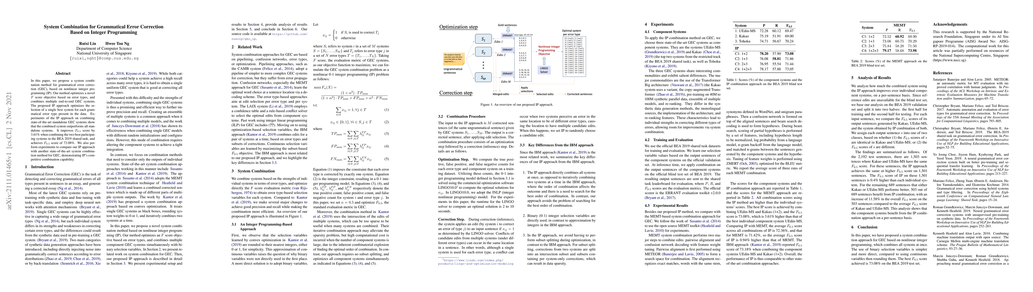 A system combination approach for Grammatical Error Correction (GEC) was proposed, combining all systems at once using non-linear integer programming.