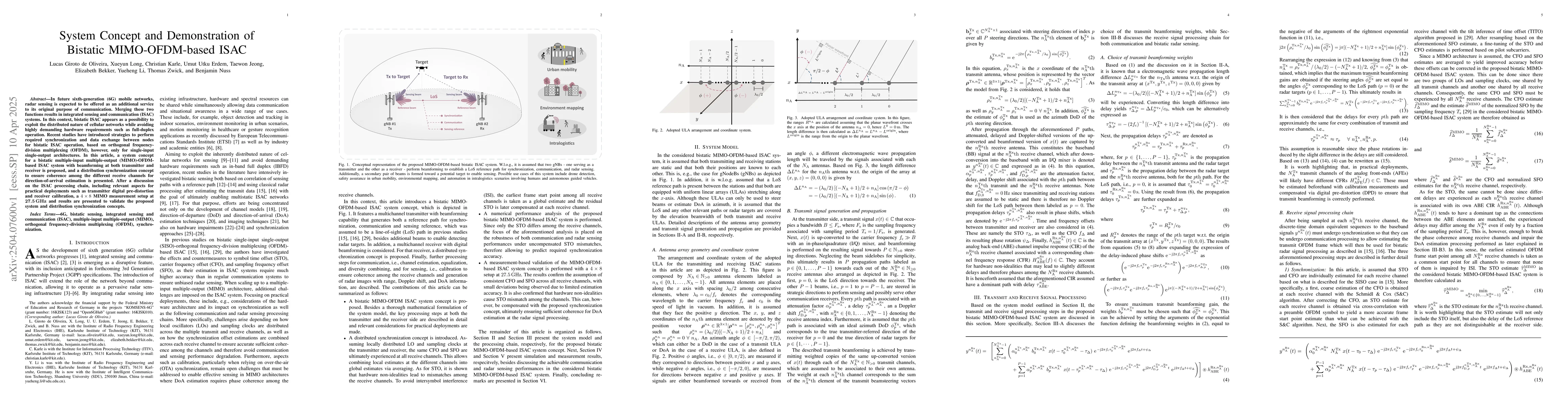 The paper proposes a system concept for a bistatic MIMO-OFDM-based ISAC system with beamforming at both transmitter and receiver, and presents a distribution synchronization concept for direction-of-arrival estimation.