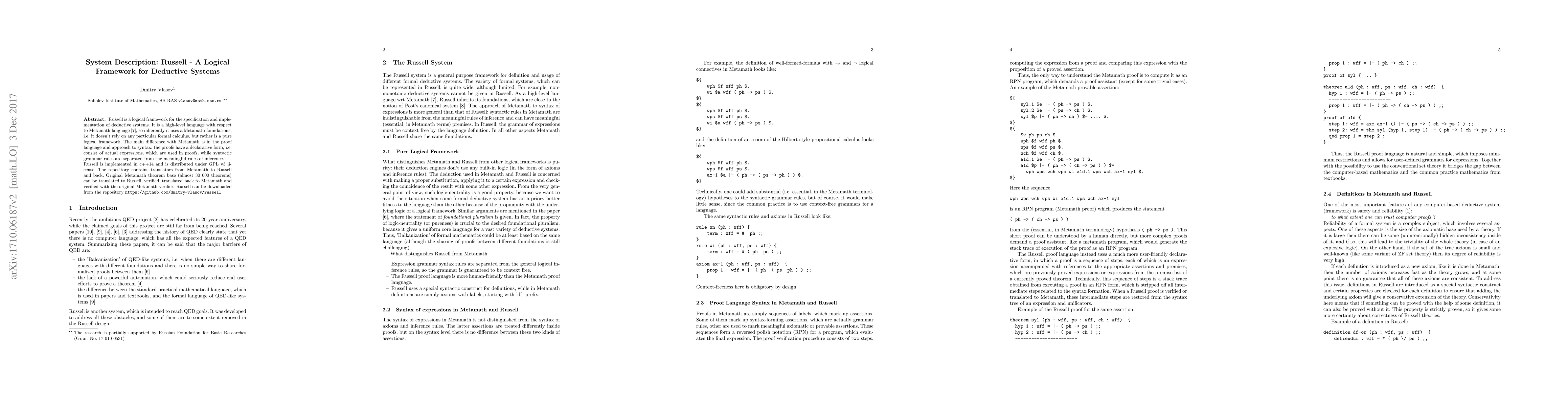 Russell is a logical framework for the specification and implementation of deductive systems. It is a high-level language with respect to Metamath language, so inherently it uses a Metamath foundations, i.e. it doesn't rely on any particular formal calculus, but rather is a pure logical framework. The main difference with Metamath is in the proof language and approach to syntax: the proofs have a declarative form, i.e. consist of actual expressions, which are used in proofs, while syntactic grammar rules are separated from the meaningful rules of inference. Russell is implemented in c++14 and is distributed under GPL v3 license. The repository contains translators from Metamath to Russell and back. Original Metamath theorem base (almost 30 000 theorems) can be translated to Russell, verified, translated back to Metamath and verified with the original Metamath verifier. Russell can be downloaded from the repository https://github.com/dmitry-vlasov/russell