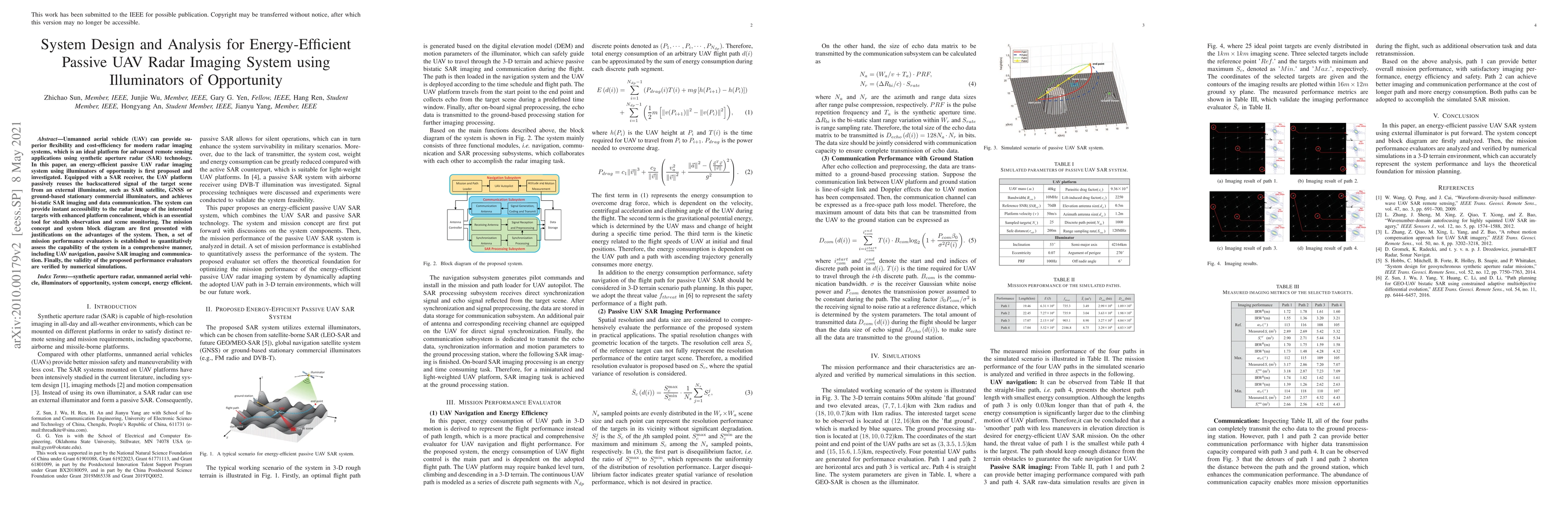 Unmanned aerial vehicle (UAV) can provide superior flexibility and cost-efficiency for modern radar imaging systems, which is an ideal platform for advanced remote sensing applications using synthetic aperture radar (SAR) technology. In this paper, an energy-efficient passive UAV radar imaging system using illuminators of opportunity is first proposed and investigated. Equipped with a SAR receiver, the UAV platform passively reuses the backscattered signal of the target scene from an external illuminator, such as SAR satellite, GNSS or ground-based stationary commercial illuminators, and achieves bi-static SAR imaging and data communication. The system can provide instant accessibility to the radar image of the interested targets with enhanced platform concealment, which is an essential tool for stealth observation and scene monitoring. The mission concept and system block diagram are first presented with justifications on the advantages of the system. Then, a set of mission performance evaluators is established to quantitatively assess the capability of the system in a comprehensive manner, including UAV navigation, passive SAR imaging and communication. Finally, the validity of the proposed performance evaluators are verified by numerical simulations.