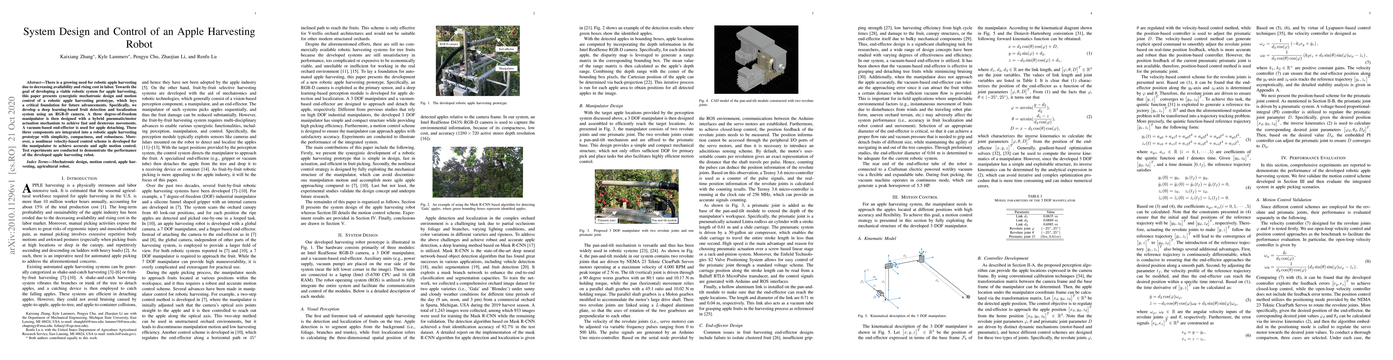This paper presents a robotic apple harvesting prototype combining deep learning-based fruit detection, a three-DOF manipulator with hybrid actuation, and a vacuum-based end-effector, all integrated with a nonlinear velocity-based control scheme for effective apple harvesting. Experimental results validate the system's performance.