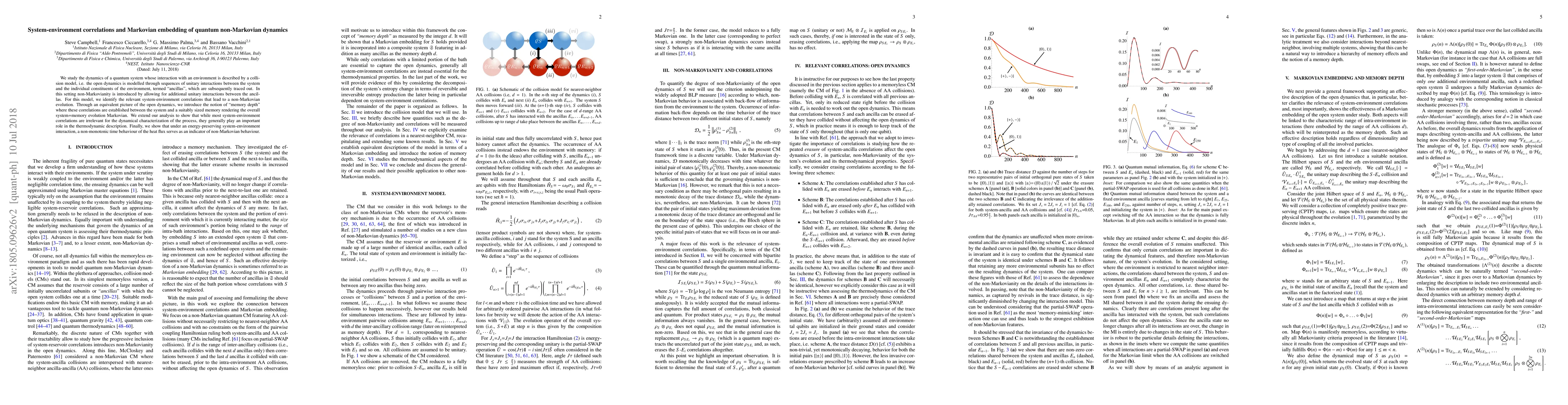 We study the dynamics of a quantum system whose interaction with an environment is described by a collision model, i.e. the open dynamics is modelled through sequences of unitary interactions between the system and the individual constituents of the environment, termed "ancillas", which are subsequently traced out. In this setting non-Markovianity is introduced by allowing for additional unitary interactions between the ancillas. For this model, we identify the relevant system-environment correlations that lead to a non-Markovian evolution. Through an equivalent picture of the open dynamics, we introduce the notion of "memory depth" where these correlations are established between the system and a suitably sized memory rendering the overall system+memory evolution Markovian. We extend our analysis to show that while most system-environment correlations are irrelevant for the dynamical characterization of the process, they generally play an important role in the thermodynamic description. Finally, we show that under an energy-preserving system-environment interaction, a non-monotonic time behaviour of the heat flux serves as an indicator of non-Markovian behaviour.