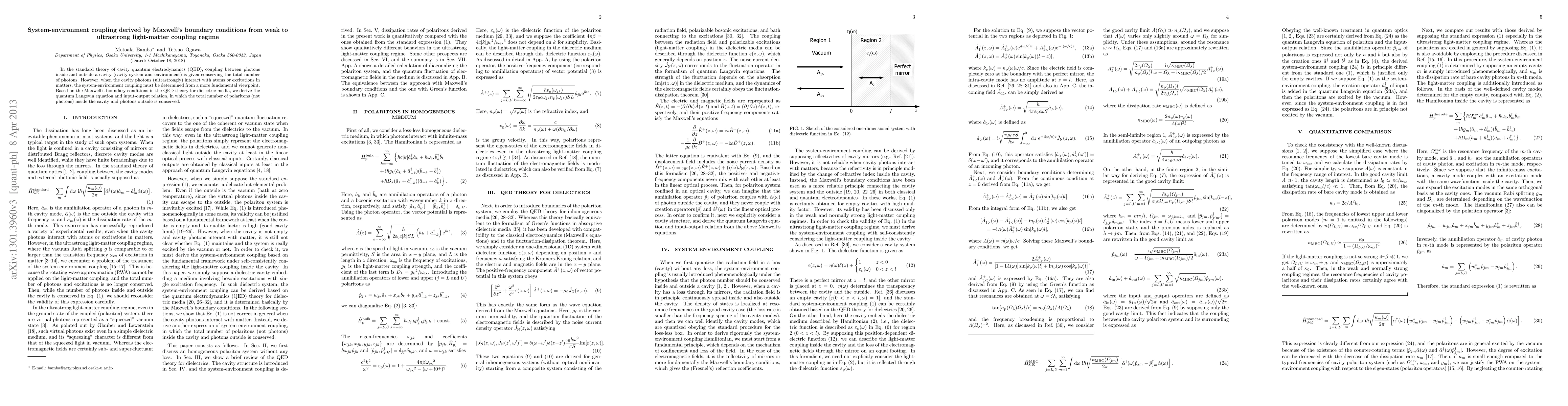 In the standard theory of cavity quantum electrodynamics (QED), coupling between photons inside and outside a cavity (cavity system and photonic reservoir) is given conserving the total number of photons. However, when the cavity photons (ultra)strongly interact with atoms or excitations in matters, the system-reservoir coupling must be determined from a more fundamental viewpoint. Based on the Maxwell's boundary conditions in the QED theory for dielectric media, we derive the quantum Langevin equation and input-output relation, in which the total number of polaritons (not photons) inside the cavity and photons outside is conserved.