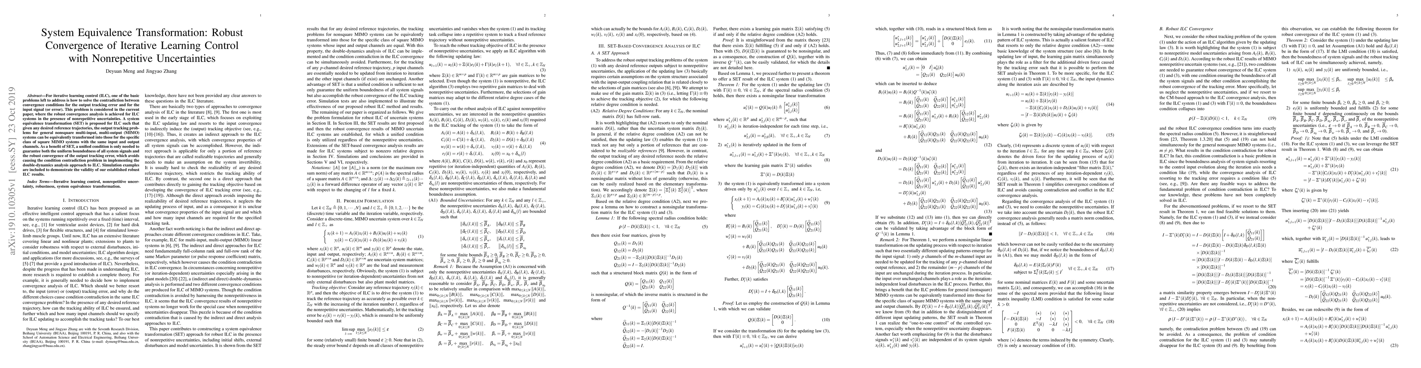 For iterative learning control (ILC), one of the basic problems left to address is how to solve the contradiction between convergence conditions for the output tracking error and for the input signal (or error). This problem is considered in the current paper, where the robust convergence analysis is achieved for ILC systems in the presence of nonrepetitive uncertainties. A system equivalence transformation (SET) is proposed for ILC such that given any desired reference trajectories, the output tracking problems for general nonsquare multi-input, multi-output (MIMO) systems can be equivalently transformed into those for the specific class of square MIMO systems with the same input and output channels. As a benefit of SET, a unified condition is only needed to guarantee both the uniform boundedness of all system signals and the robust convergence of the output tracking error, which avoids causing the condition contradiction problem in implementing the double-dynamics analysis approach to ILC. Simulation examples are included to demonstrate the validity of our established robust ILC results.