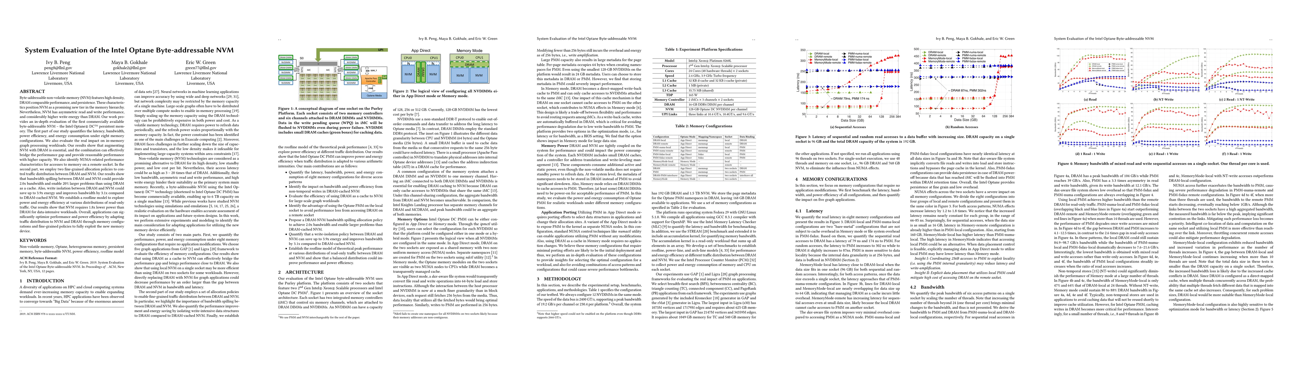 This research evaluates Intel Optane DC persistent memory, assessing its latency, bandwidth, power efficiency, and energy consumption. The study finds that augmenting NVM with DRAM can bridge performance gaps, and fine-grained allocation policies improve bandwidth and save energy, highlighting NVM's potential in data-intensive workloads.