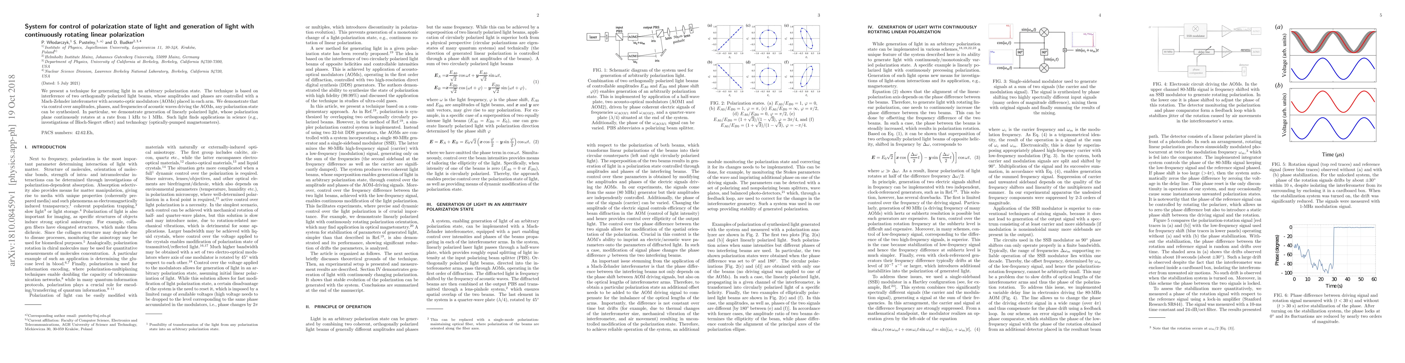 We present a technique for generating light in an arbitrary polarization state. The technique is based on interference of two orthogonally polarized light beams, whose amplitudes and phases are controlled with a Mach-Zehnder inteferometer with acousto-optic modulators (AOMs) placed in each arm. We demonstrate that via control over amplitudes, phases, and frequencies of acoustic waves driving the AOMs, any polarization state can be synthesized. In particular, we demonstrate generation of linearly polarized light, whose polarization plane continuously rotates at a rate from 1~kHz to 1~MHz. Such light finds applications in science (e.g., investigations of Bloch-Siegert effect) and technology (optically-pumped magnetometers).