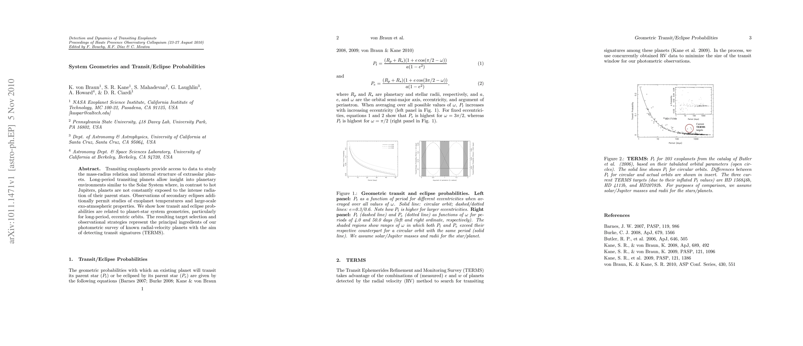 Transiting exoplanets provide access to data to study the mass-radius relation and internal structure of extrasolar planets. Long-period transiting planets allow insight into planetary environments similar to the Solar System where, in contrast to hot Jupiters, planets are not constantly exposed to the intense radiation of their parent stars. Observations of secondary eclipses additionally permit studies of exoplanet temperatures and large-scale exo-atmospheric properties. We show how transit and eclipse probabilities are related to planet-star system geometries, particularly for long-period, eccentric orbits. The resulting target selection and observational strategies represent the principal ingredients of our photometric survey of known radial-velocity planets with the aim of detecting transit signatures (TERMS).
