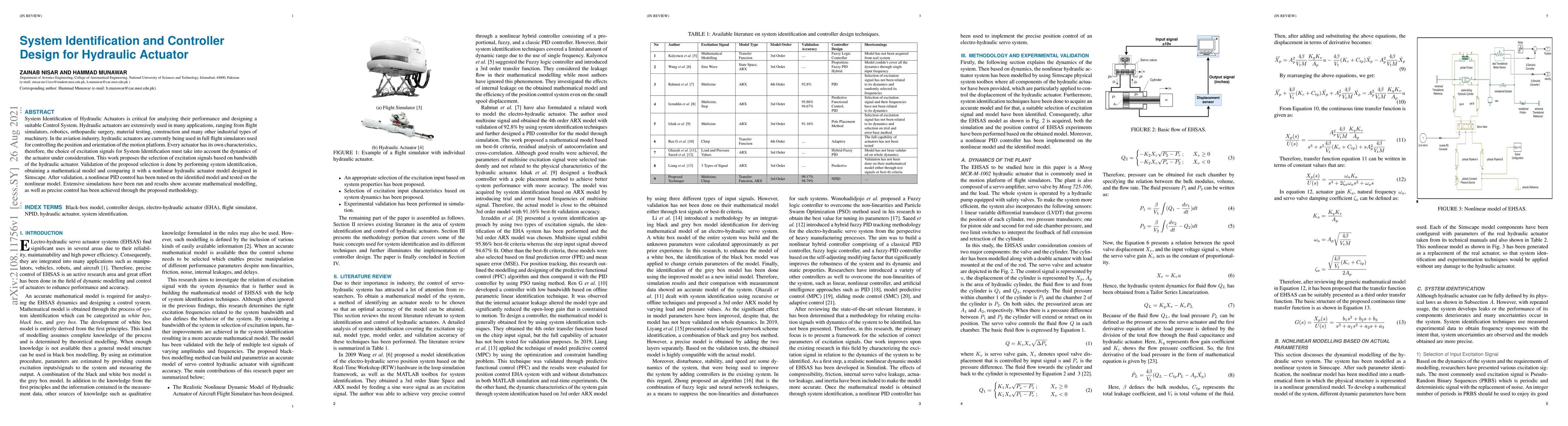 System Identification of Hydraulic Actuators is critical for analyzing their performance and designing a suitable Control System. Hydraulic actuators are extensively used in many applications, ranging from flight simulators, robotics, orthopaedic surgery, material testing, construction and many other industrial types of machinery. In the aviation industry, hydraulic actuators are currently being used in full flight simulators used for controlling the position and orientation of the motion platform. Every actuator has its own characteristics, therefore, the choice of excitation signals for System Identification must take into account the dynamics of the actuator under consideration. This work proposes the selection of excitation signals based on bandwidth of the hydraulic actuator. Validation of the proposed selection is done by performing system identification, obtaining a mathematical model and comparing it with a nonlinear hydraulic actuator model designed in Simscape. After validation, a nonlinear PID control has been tuned on the identified model and tested on the nonlinear model. Extensive simulations have been run and results show accurate mathematical modelling, as well as precise control has been achieved through the proposed methodology.