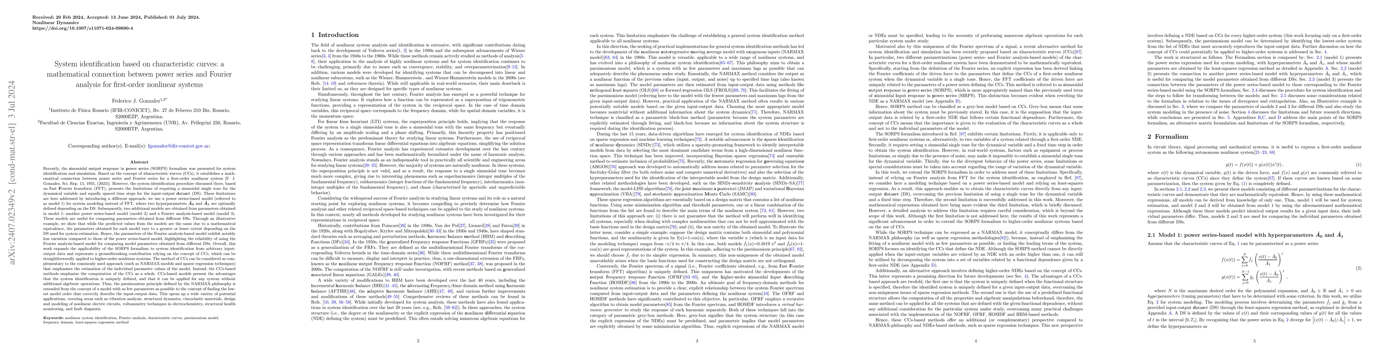 This paper introduces a novel system identification method based on characteristic curves (CCs) that connects power series and Fourier analysis for first-order nonlinear systems, overcoming limitations of existing methods that require specific input conditions. The new approach uses a power series model defined by two hyperparameters, expanding the applicability of the SORPS formalism to various datasets.