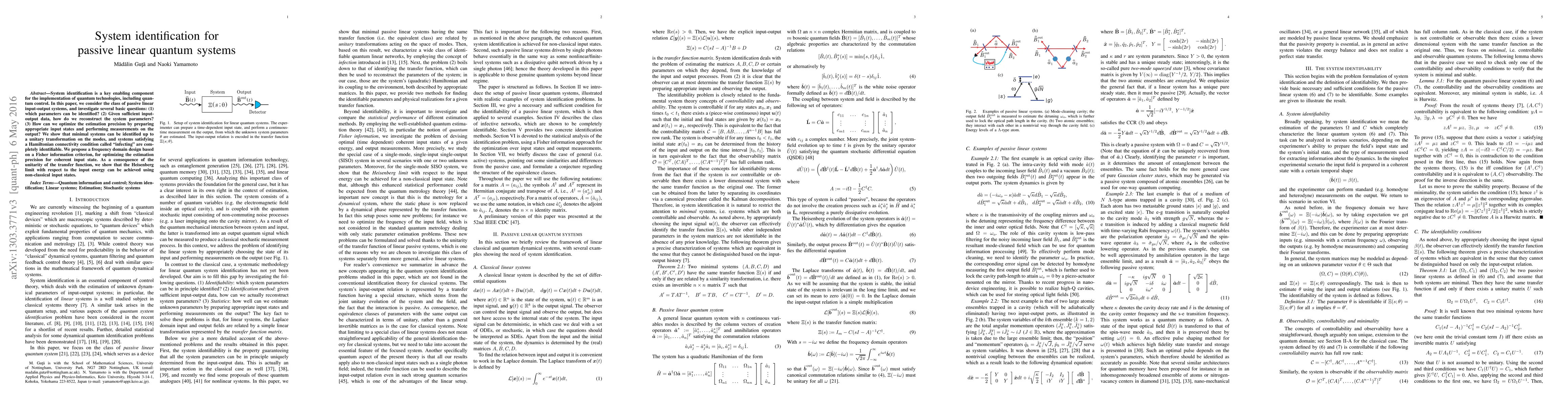 System identification is a key enabling component for the implementation of quantum technologies, including quantum control. In this paper, we consider the class of passive linear input-output systems, and investigate several basic questions: (1) which parameters can be identified? (2) Given sufficient input-output data, how do we reconstruct the system parameters? (3) How can we optimize the estimation precision by preparing appropriate input states and performing measurements on the output? We show that minimal systems can be identified up to a unitary transformation on the modes, and systems satisfying a Hamiltonian connectivity condition called "infecting" are completely identifiable. We propose a frequency domain design based on a Fisher information criterion, for optimizing the estimation precision for coherent input state. As a consequence of the unitarity of the transfer function, we show that the Heisenberg limit with respect to the input energy can be achieved using non-classical input states.