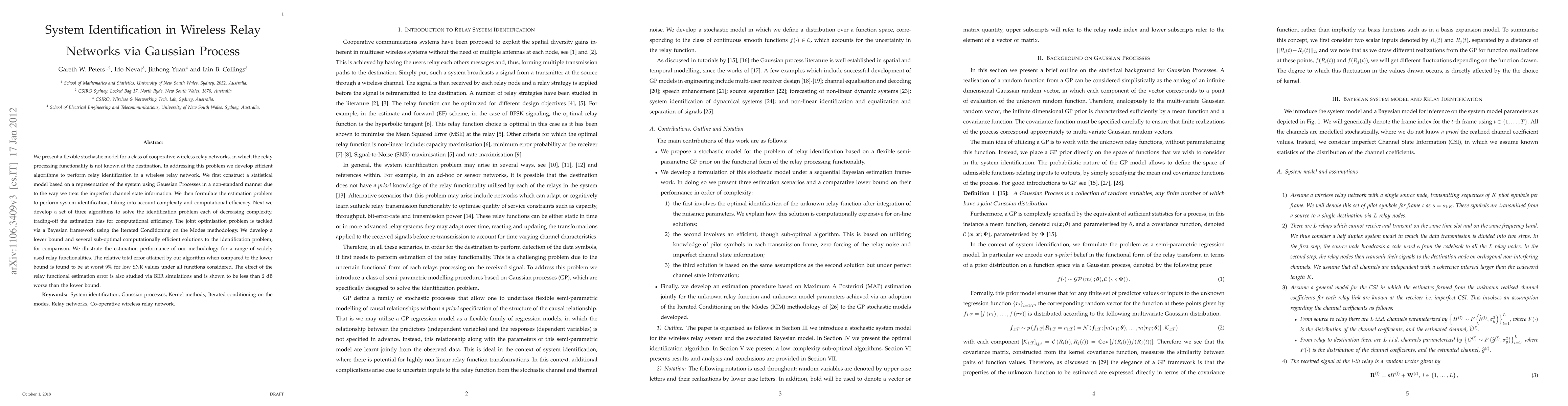 We present a flexible stochastic model for a class of cooperative wireless relay networks, in which the relay processing functionality is not known at the destination. In addressing this problem we develop efficient algorithms to perform relay identification in a wireless relay network. We first construct a statistical model based on a representation of the system using Gaussian Processes in a non-standard manner due to the way we treat the imperfect channel state information. We then formulate the estimation problem to perform system identification, taking into account complexity and computational efficiency. Next we develop a set of three algorithms to solve the identification problem each of decreasing complexity, trading-off the estimation bias for computational efficiency. The joint optimisation problem is tackled via a Bayesian framework using the Iterated Conditioning on the Modes methodology. We develop a lower bound and several sub-optimal computationally efficient solutions to the identification problem, for comparison. We illustrate the estimation performance of our methodology for a range of widely used relay functionalities. The relative total error attained by our algorithm when compared to the lower bound is found to be at worst 9% for low SNR values under all functions considered. The effect of the relay functional estimation error is also studied via BER simulations and is shown to be less than 2dB worse than the lower bound.