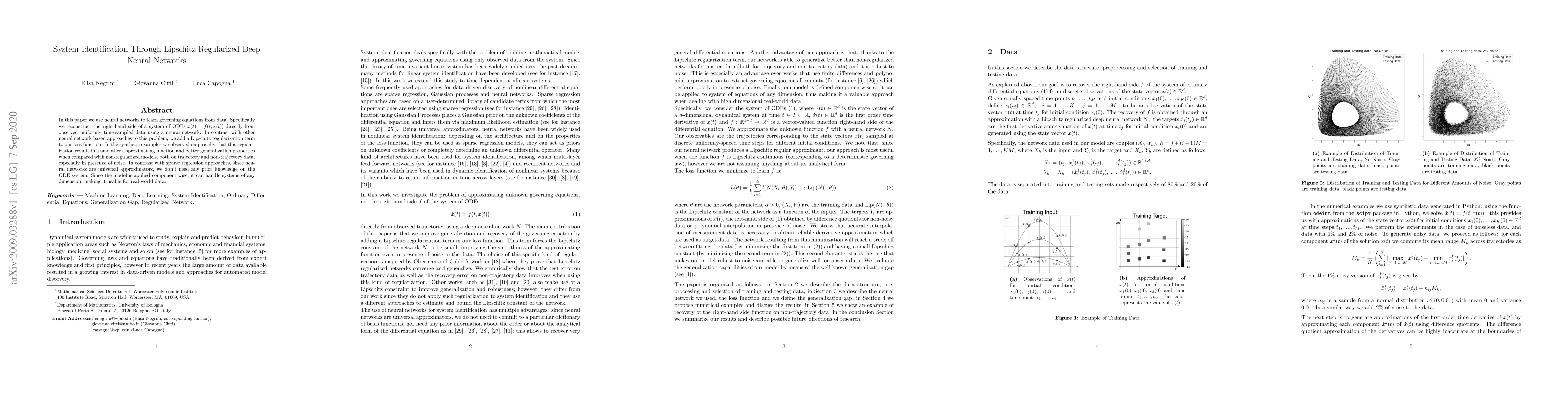This paper proposes a method for system identification using Lipschitz regularized deep neural networks to reconstruct the right-hand side of ODEs from data. The Lipschitz regularization leads to smoother approximations and better generalization, especially in noisy conditions, compared to non-regularized models.