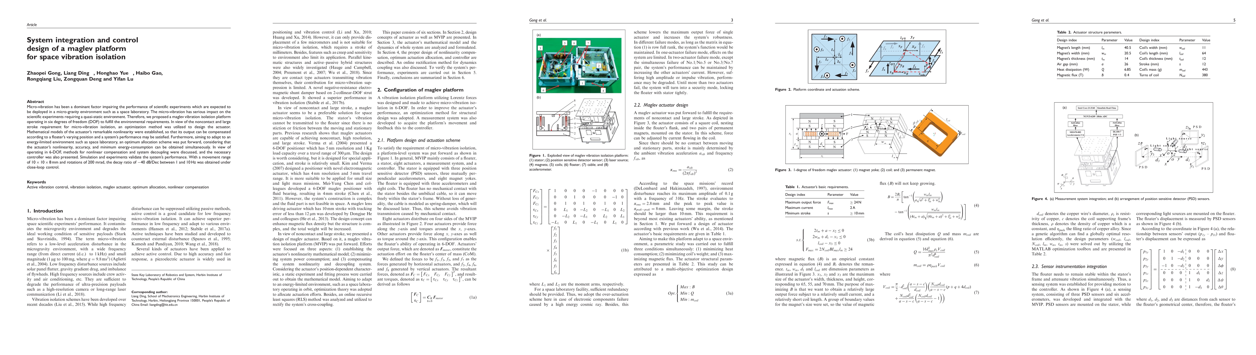 Micro-vibration has been a dominant factor impairing the performance of scientific experiments which are expected to be deployed in a micro-gravity environment such as Spacelab. The micro-vibration has a serious impact on scientific experiments requiring a quasi-static environment. Therefore, we proposed a maglev vibration isolation platform (MVIP) operating in six degrees of freedom (DOF) to fulfill the environmental requirements. In view of non-contact and large stroke requirements for micro-vibration isolation, an optimization method was utilized to design the actuator. Mathematical models of the actuator's remarkable nonlinearity were established so that its output can be compensated according to floater's varying position and the system's performance may be satisfied. Furthermore, aiming to adapt to an energy-limited environment such as Spacelab, an optimum allocation scheme was put forward. Considering the actuator's nonlinearity, accuracy and minimum energy-consumption can be obtained simultaneously. In view of operating in six DOF, methods for nonlinear compensation and system decoupling were discussed, the necessary controller was also presented. Simulation and experiments validate the system's performance. With a movement range of 10x10x8 mm and rotations of 200 mrad, the decay ratio of -40 dB/Dec between 1-10 Hz was obtained under closed-loop control.