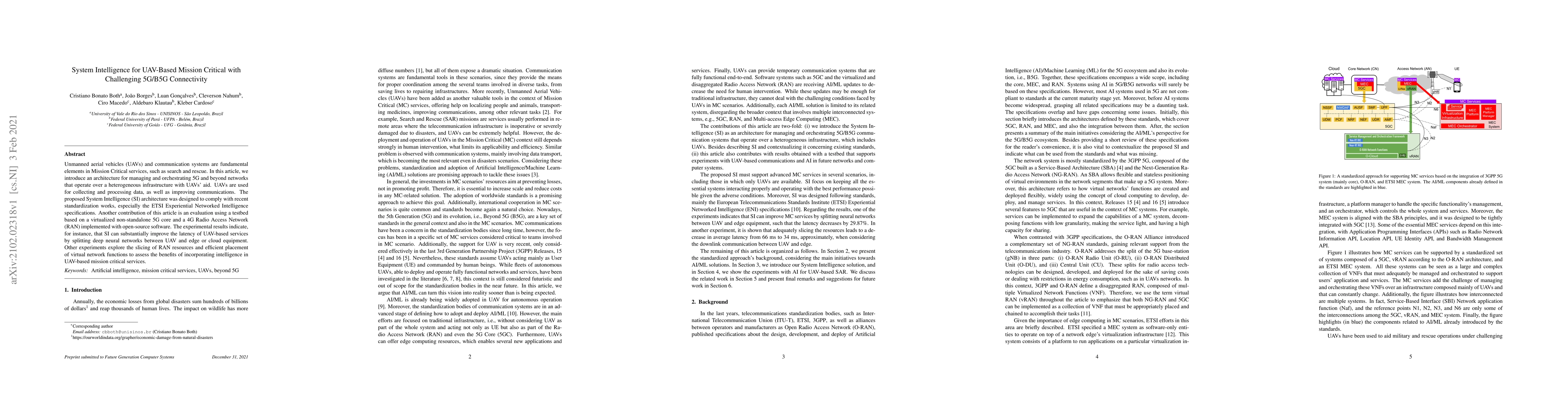 This paper proposes a System Intelligence (SI) architecture for managing 5G/B5G networks with UAVs to enhance mission-critical services like search and rescue. The SI architecture improves communication and data processing, significantly reducing latency by leveraging edge and cloud resources.