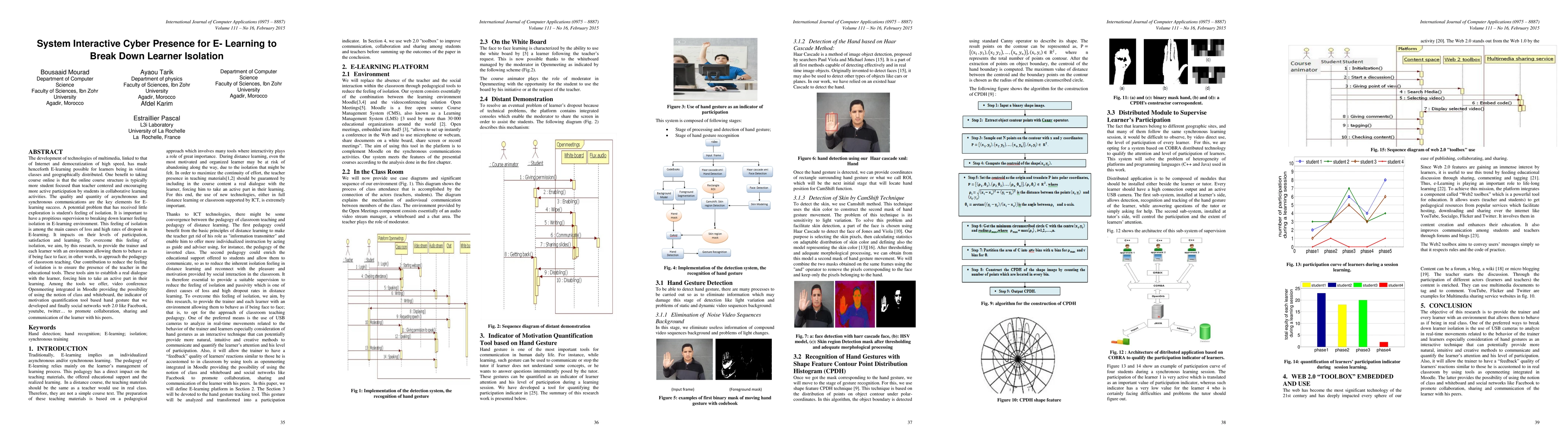 The development of technologies of multimedia, linked to that of Internet and democratization of high speed, has made henceforth E-learning possible for learners being in virtual classes and geographically distributed. One benefit to taking course online is that the online course structure is typically more student focused than teacher centered and encouraging more active participation by students in collaborative learning activities. The quality and quantity of asynchronous and synchronous communications are the key elements for E-learning success. A potential problem that has received little exploration is student's feeling of isolation. It is important to have a propitious supervision to breaking down learner feeling isolation in E learning environment. This feeling of isolation is among the main causes of loss and high rates of dropout in E-learning. It impacts on their levels of participation, satisfaction and learning. To overcome this feeling of isolation, we aim, by this research, to provide the trainer and each learner with an environment allowing them to behave as if being face to face; in other words, to approach the pedagogy of classroom teaching. Our contribution to reduce the feeling of isolation is to ensure the presence of the teacher in the educational tools. These tools aim to establish a real dialogue with the learner, forcing him to take an active part in their learning. Among the tools we offer, video conference Openmeeting integrated in Moodle providing the possibility of using the notion of class and whiteboard, the indicator of motivation quantification tool based hand gesture that we developed and finally social networks web 2. 0 like Facebook, youtube, twitter to promote collaboration, sharing and communication of the learner with his peers.