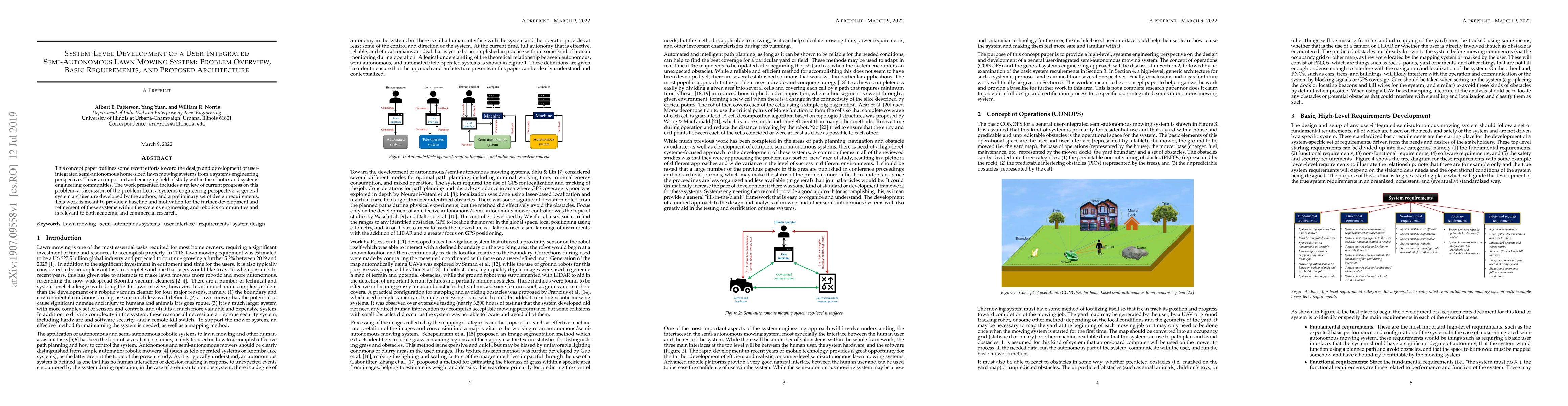This concept paper outlines some recent efforts toward the design and development of user-integrated semi-autonomous home-sized lawn mowing systems from a systems engineering perspective. This is an important and emerging field of study within the robotics and systems engineering communities. The work presented includes a review of current progress on this problem, a discussion of the problem from a systems engineering perspective, a general system architecture developed by the authors, and a preliminary set of design requirements. This work is meant to provide a baseline and motivation for the further development and refinement of these systems within the systems engineering and robotics communities and is relevant to both academic and commercial research.