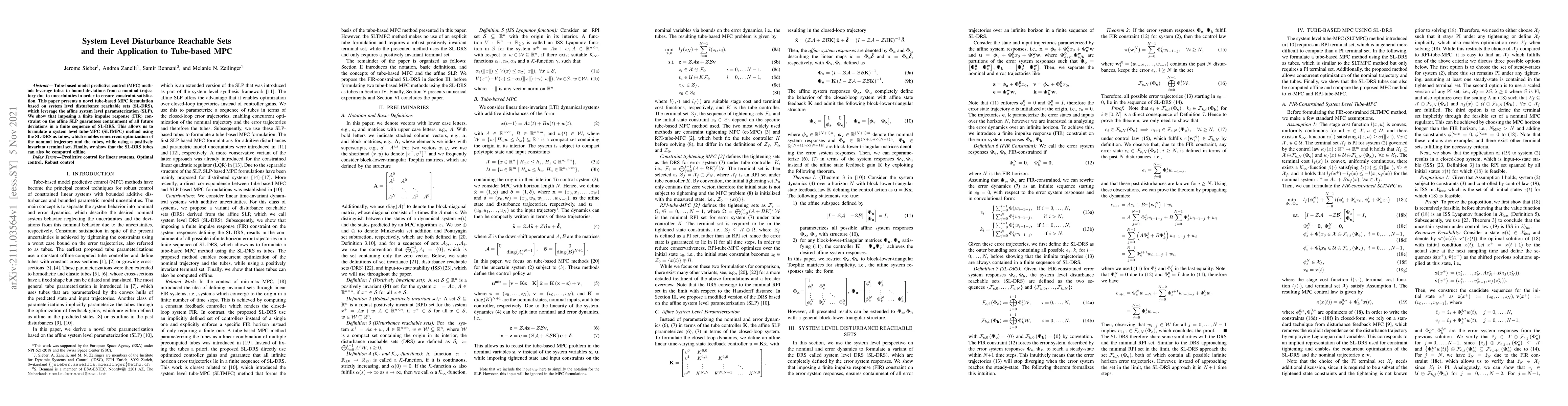 This paper introduces a novel tube-based MPC method using system level disturbance reachable sets (SL-DRS) and affine system level parameterization (SLP). It demonstrates that an FIR constraint on SLP ensures containment of future deviations within SL-DRS, enabling a system level tube-MPC (SLTMPC) method that optimizes both the nominal trajectory and the tubes, with offline computation of SL-DRS tubes.