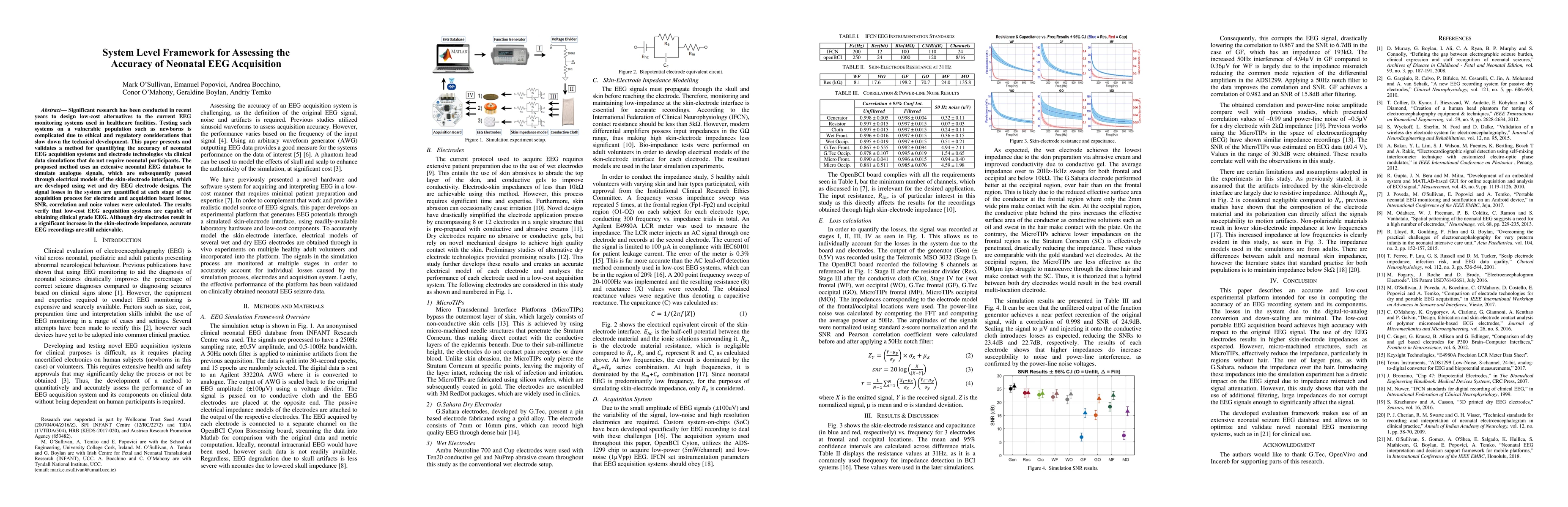 Significant research has been conducted in recent years to design low-cost alternatives to the current EEG monitoring systems used in healthcare facilities. Testing such systems on a vulnerable population such as newborns is complicated due to ethical and regulatory considerations that slow down the technical development. This paper presents and validates a method for quantifying the accuracy of neonatal EEG acquisition systems and electrode technologies via clinical data simulations that do not require neonatal participants. The proposed method uses an extensive neonatal EEG database to simulate analogue signals, which are subsequently passed through electrical models of the skin-electrode interface, which are developed using wet and dry EEG electrode designs. The signal losses in the system are quantified at each stage of the acquisition process for electrode and acquisition board losses. SNR, correlation and noise values were calculated. The results verify that low-cost EEG acquisition systems are capable of obtaining clinical grade EEG. Although dry electrodes result in a significant increase in the skin-electrode impedance, accurate EEG recordings are still achievable.