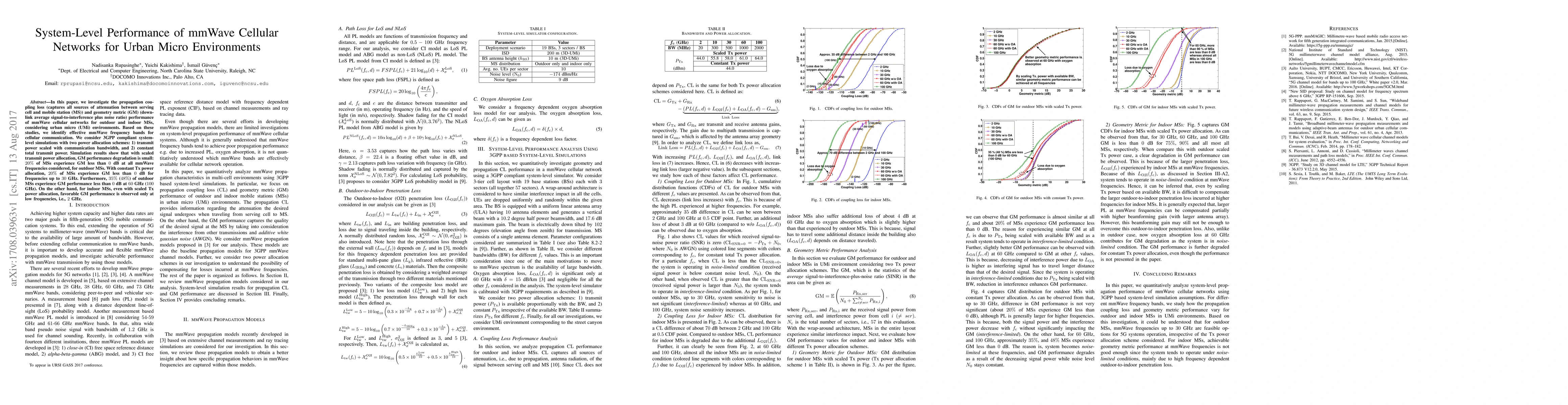 This paper evaluates the performance of mmWave cellular networks in urban micro environments, focusing on propagation loss and signal-to-interference plus noise ratio (GM). Results show that scaled transmit power allocation maintains better GM performance, especially for outdoor mobile stations at lower frequencies, while constant power allocation degrades significantly at higher frequencies. Indoor performance favors low frequencies.