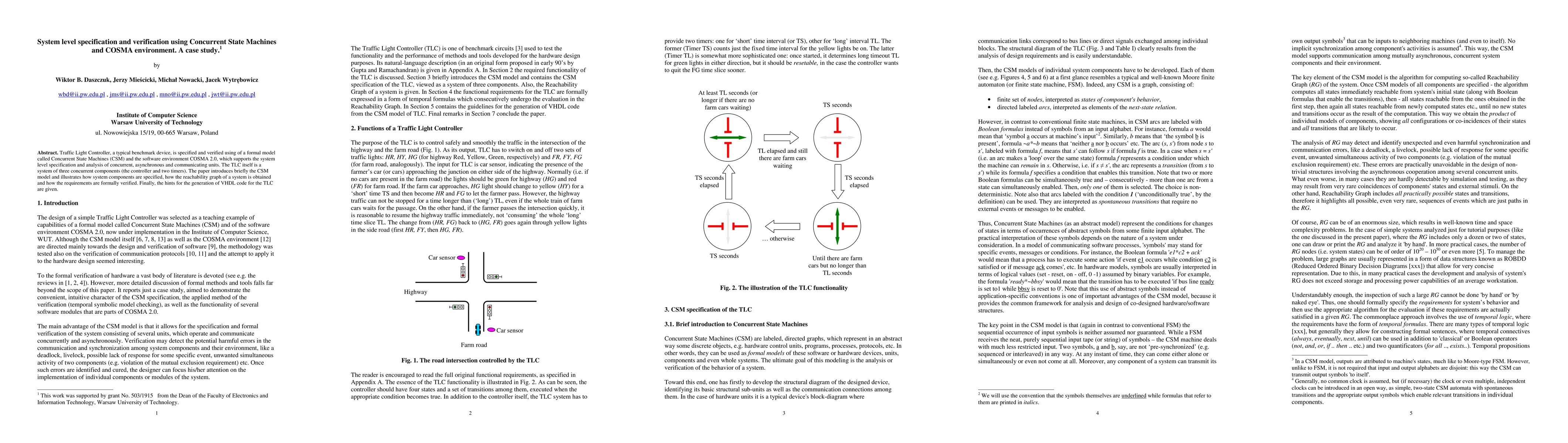 This paper specifies and verifies a Traffic Light Controller using Concurrent State Machines (CSM) and the COSMA 2.0 environment, demonstrating how to model concurrent components and formally verify system requirements. The paper also provides guidance on generating VHDL code from the model.