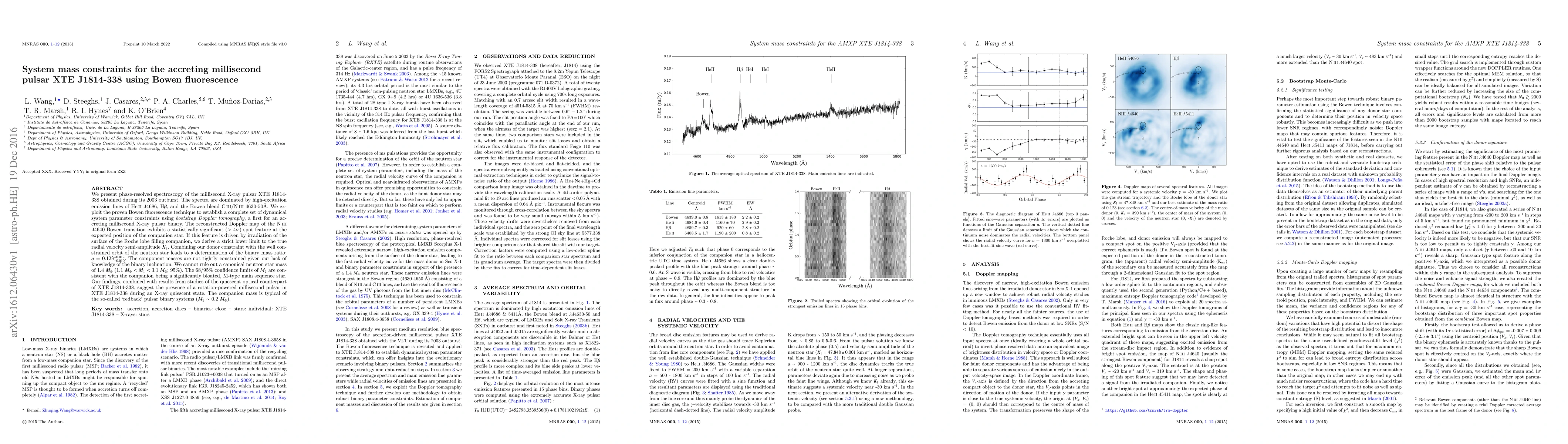 This paper uses phase-resolved spectroscopy and Bowen fluorescence to derive mass constraints for the accreting millisecond pulsar XTE J1814-338, determining a binary mass ratio of q = 0.123 ± 0.012, with the companion likely being a bloated M-type main sequence star.