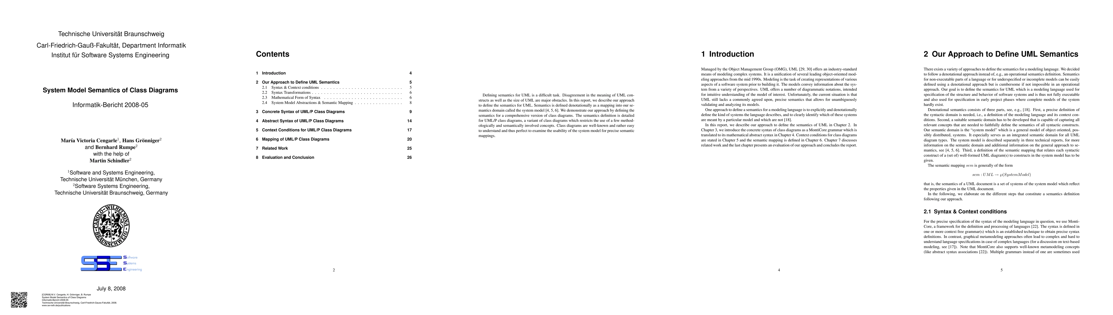 This paper presents a denotational approach to defining semantics for UML, focusing on class diagrams. It introduces a system model called the semantics domain to precisely map UML constructs, demonstrating this with UML/P class diagrams, a simplified variant to ensure clarity and usability.