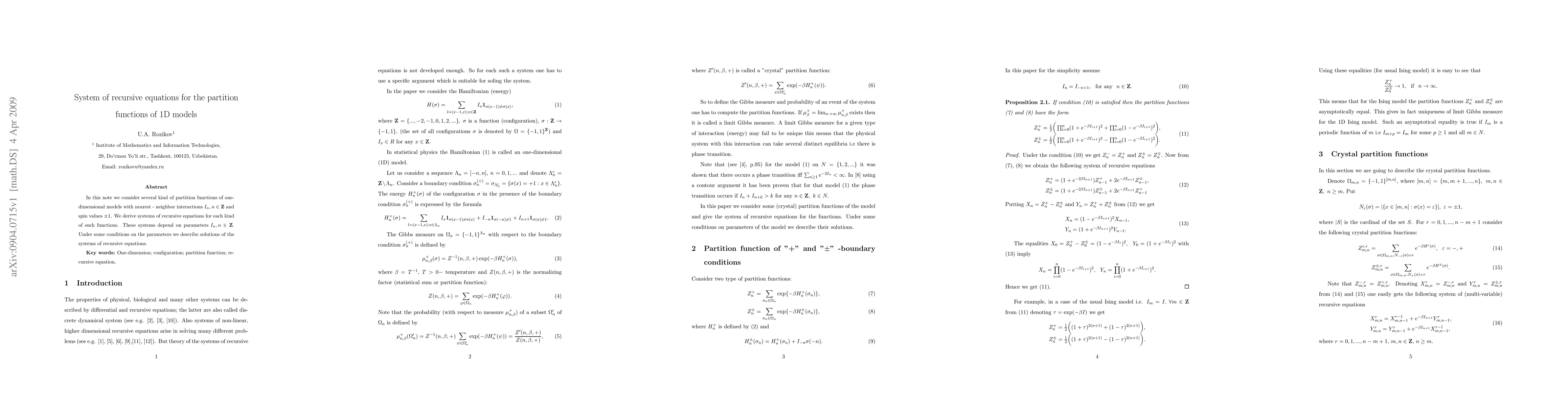 Researchers developed recursive equations for partition functions in 1D models with nearest-neighbor interactions, describing solutions under specific parameter conditions.