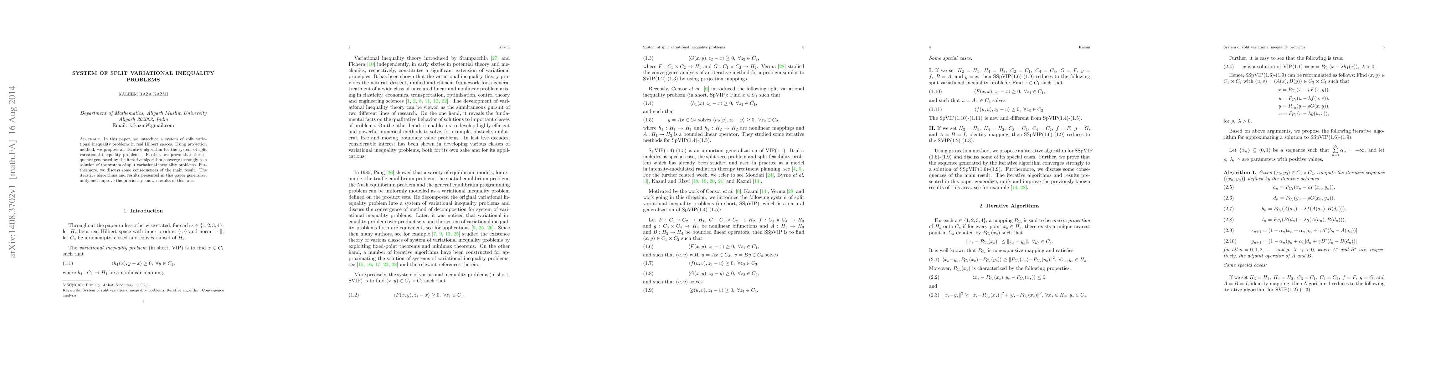 This paper introduces a system of split variational inequality problems in Hilbert spaces and proposes an iterative algorithm using projection methods. The authors prove strong convergence of the algorithm to a solution and discuss its generalizing and unifying impact on prior research.