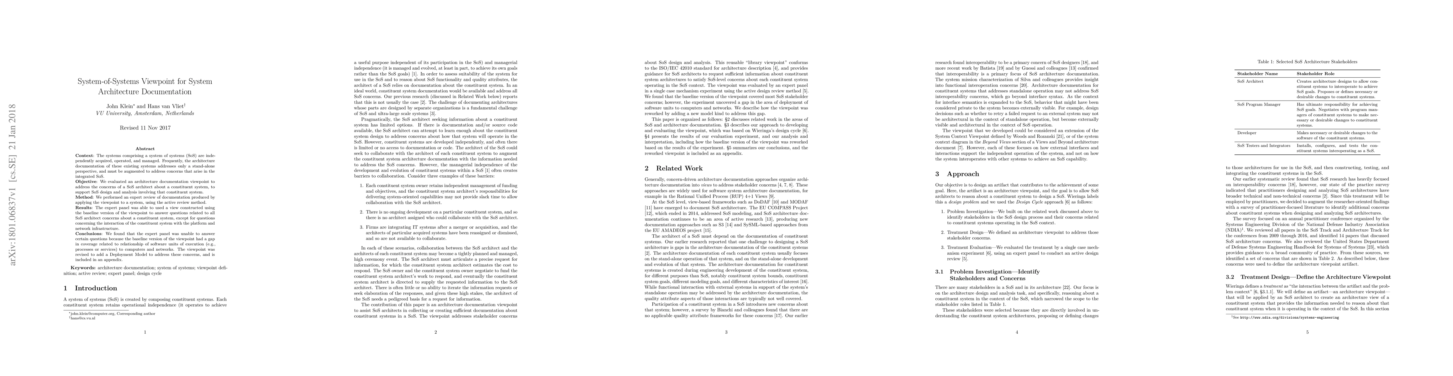 Context: The systems comprising a system of systems (SoS) are inde- pendently acquired, operated, and managed. Frequently, the architecture documentation of these existing systems addresses only a stand-alone perspective, and must be augmented to address concerns that arise in the integrated SoS. Objective: We evaluated an architecture documentation viewpoint to address the concerns of a SoS architect about a constituent system, to support SoS design and analysis involving that constituent system. Method: We performed an expert review of documentation produced by applying the viewpoint to a system, using the active review method. Results: The expert panel was able to used a view constructed using the baseline version of the viewpoint to answer questions related to all SoS architect concerns about a constituent system, except for questions concerning the interaction of the constituent system with the platform and network infrastructure. Conclusions: We found that the expert panel was unable to answer certain questions because the baseline version of the viewpoint had a gap in coverage related to relationship of software units of execution (e.g., processes or services) to computers and networks. The viewpoint was revised to add a Deployment Model to address these concerns, and is included in an appendix.