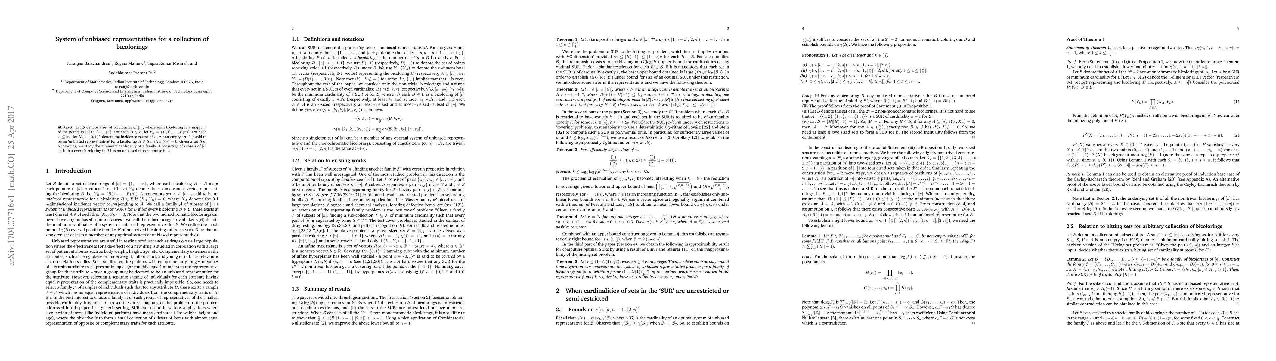 Let $\mathcal{B}$ denote a set of bicolorings of $[n]$, where each bicoloring is a mapping of the points in $[n]$ to $\{-1,+1\}$. For each $B \in \mathcal{B}$, let $Y_B=(B(1),\ldots,B(n))$. For each $A \subseteq [n]$, let $X_A \in \{0,1\}^n$ denote the incidence vector of $A$. A non-empty set $A$ is said to be an `unbiased representative' for a bicoloring $B \in \mathcal{B}$ if $\left\langle X_A,Y_B\right\rangle =0$. Given a set $\mathcal{B}$ of bicolorings, we study the minimum cardinality of a family $\mathcal{A}$ consisting of subsets of $[n]$ such that every bicoloring in $\mathcal{B}$ has an unbiased representative in $\mathcal{A}$.