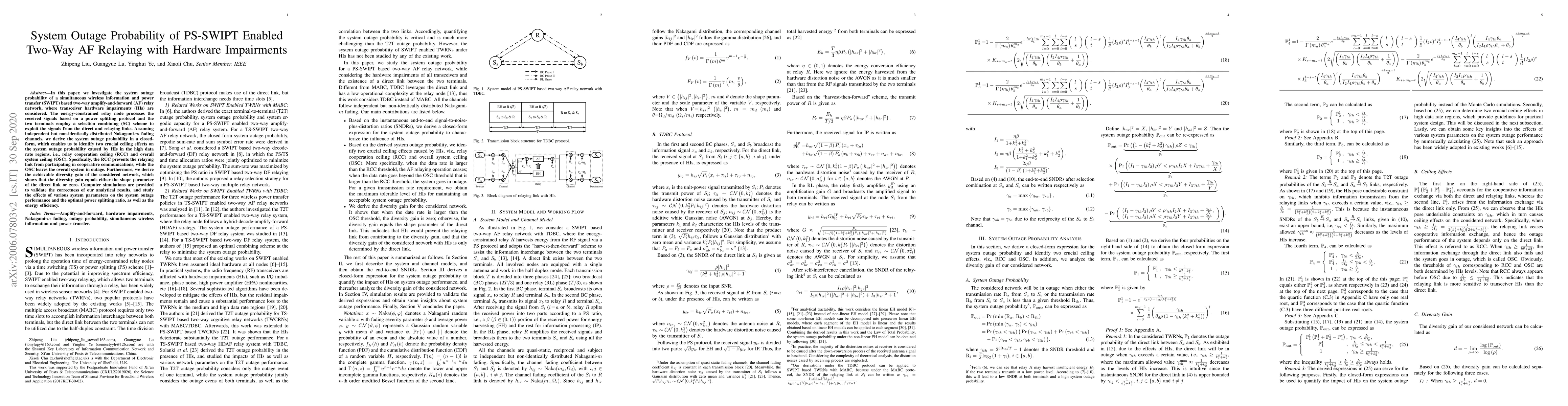 This paper investigates the system outage probability of a SWIPT-based two-way AF relay network with hardware impairments, deriving a closed-form expression for outage probability under Nakagami-m fading. It identifies two ceiling effects caused by hardware impairments and provides insights into the achievable diversity gain.
