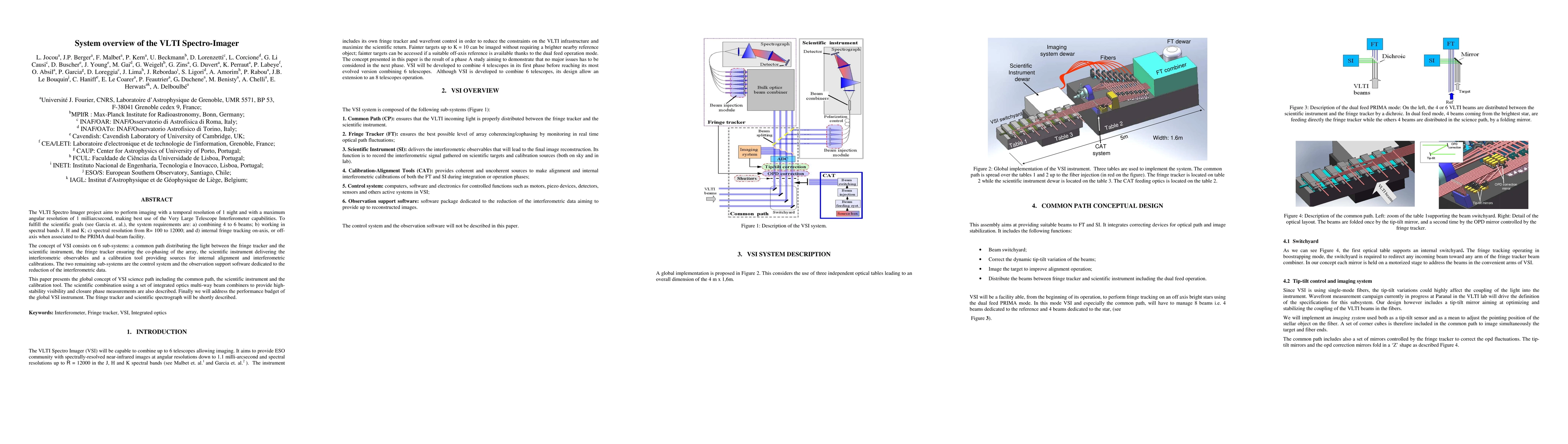 The VLTI Spectro Imager project aims to perform imaging with a temporal resolution of 1 night and with a maximum angular resolution of 1 milliarcsecond, making best use of the Very Large Telescope Interferometer capabilities. To fulfill the scientific goals (see Garcia et. al.), the system requirements are: a) combining 4 to 6 beams; b) working in spectral bands J, H and K; c) spectral resolution from R= 100 to 12000; and d) internal fringe tracking on-axis, or off-axis when associated to the PRIMA dual-beam facility. The concept of VSI consists on 6 sub-systems: a common path distributing the light between the fringe tracker and the scientific instrument, the fringe tracker ensuring the co-phasing of the array, the scientific instrument delivering the interferometric observables and a calibration tool providing sources for internal alignment and interferometric calibrations. The two remaining sub-systems are the control system and the observation support software dedicated to the reduction of the interferometric data. This paper presents the global concept of VSI science path including the common path, the scientific instrument and the calibration tool. The scientific combination using a set of integrated optics multi-way beam combiners to provide high-stability visibility and closure phase measurements are also described. Finally we will address the performance budget of the global VSI instrument. The fringe tracker and scientific spectrograph will be shortly described.