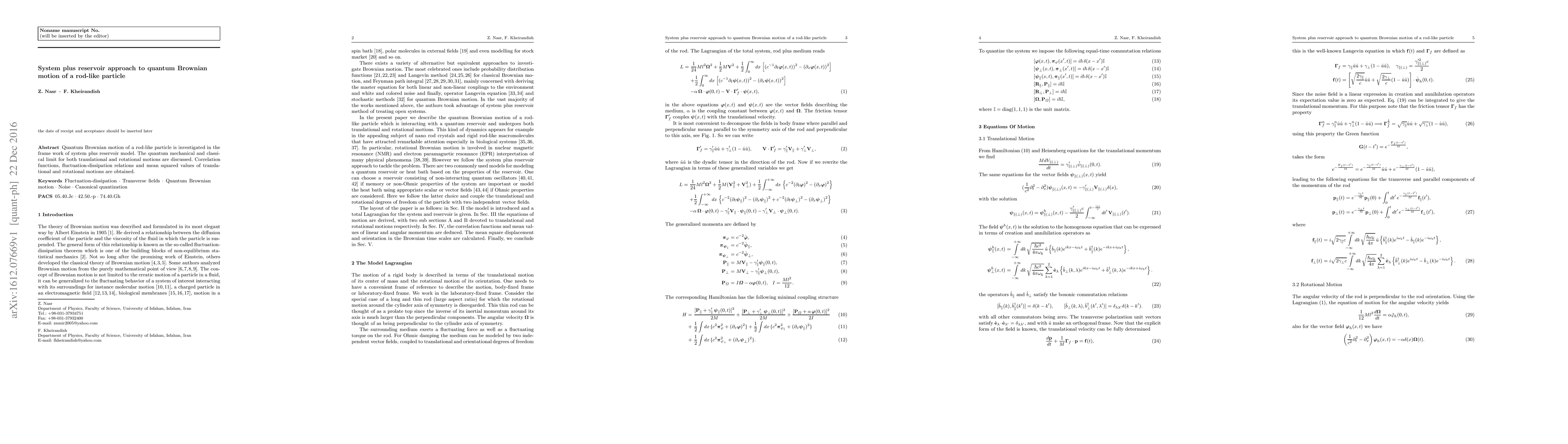 Quantum Brownian motion of a rod-like particle is investigated in the frame work of system plus reservoir model. The quantum mechanical and classical limit for both translational and rotational motions are discussed. Correlation functions, fluctuation-dissipation relations and mean squared values of translational and rotational motions are obtained.