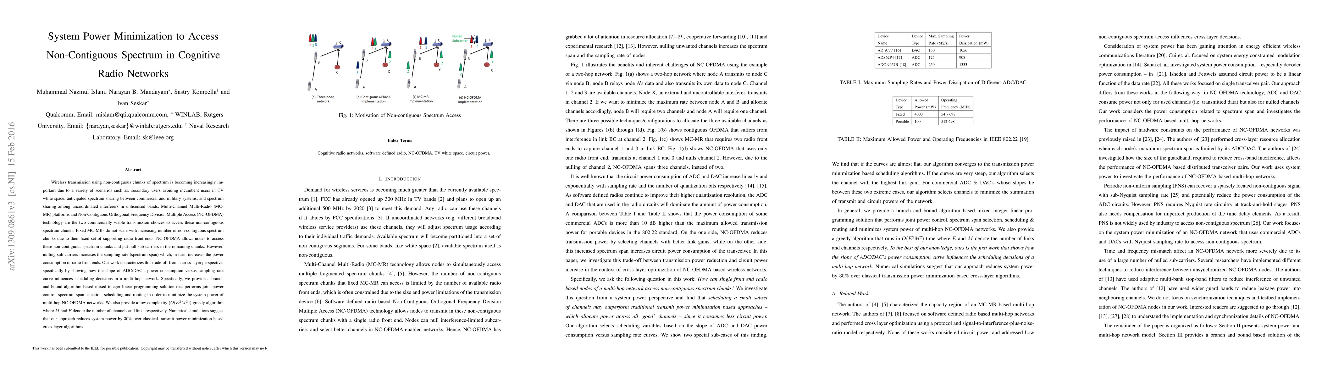 This paper proposes a method for minimizing system power in cognitive radio networks accessing non-contiguous spectrum using NC-OFDMA. It introduces a branch and bound algorithm and a low complexity greedy algorithm to jointly optimize power control, spectrum span selection, scheduling, and routing, achieving a 30% reduction in system power compared to traditional methods.