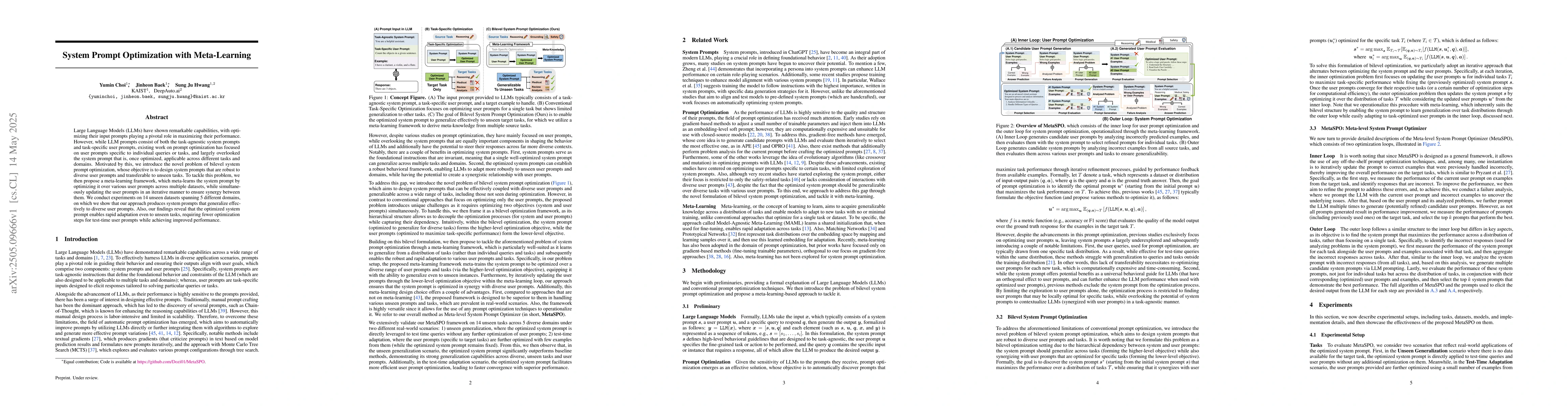 The research introduces a meta-learning framework for optimizing system prompts in Large Language Models (LLMs) that are robust to diverse user prompts and transferable to unseen tasks, achieved by meta-learning the system prompt over various user prompts across multiple datasets while iteratively updating the user prompts.