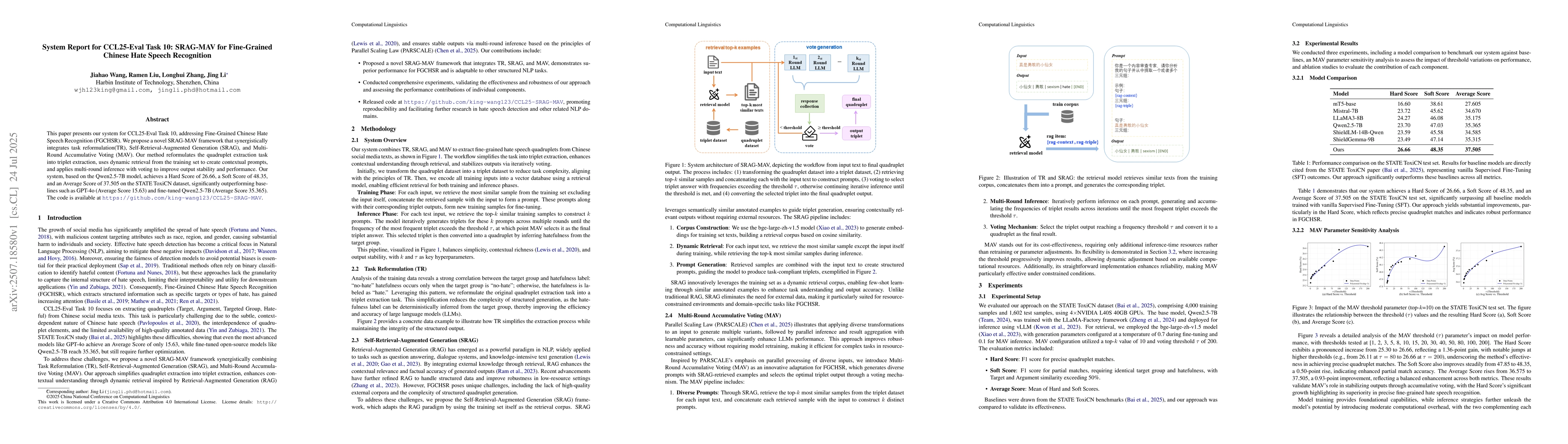 The paper introduces SRAG-MAV, a novel framework for fine-grained Chinese hate speech recognition, outperforming baselines with scores of 26.66 (Hard), 48.35 (Soft), and 37.505 (Average) on the STATE ToxiCN dataset. It uses task reformulation, self-retrieval-augmented generation, and multi-round accumulative voting to enhance performance.