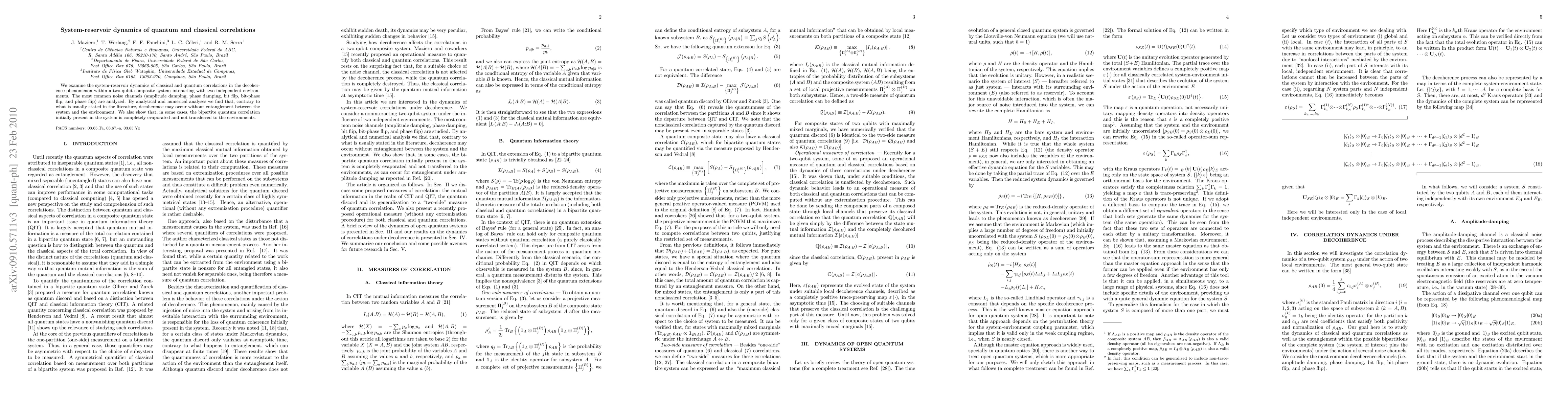 We address the system-reservoir dynamics of classical and quantum correlations in the decoherence phenomenon, regarding a two qubit composite system interacting with two independent environments. The most common noise channels (amplitude damping, phase damping, bit flip, bit-phase flip, and phase flip) was studied. By analytical and numerical analysis we found that, contrary to what is usually stated in the literature, decoherence may occurs without entanglement between the system and the environment. We also found that, in some cases, the bipartite quantum correlation initially presented in the system is completely evaporated, it is not transferred to the environments.