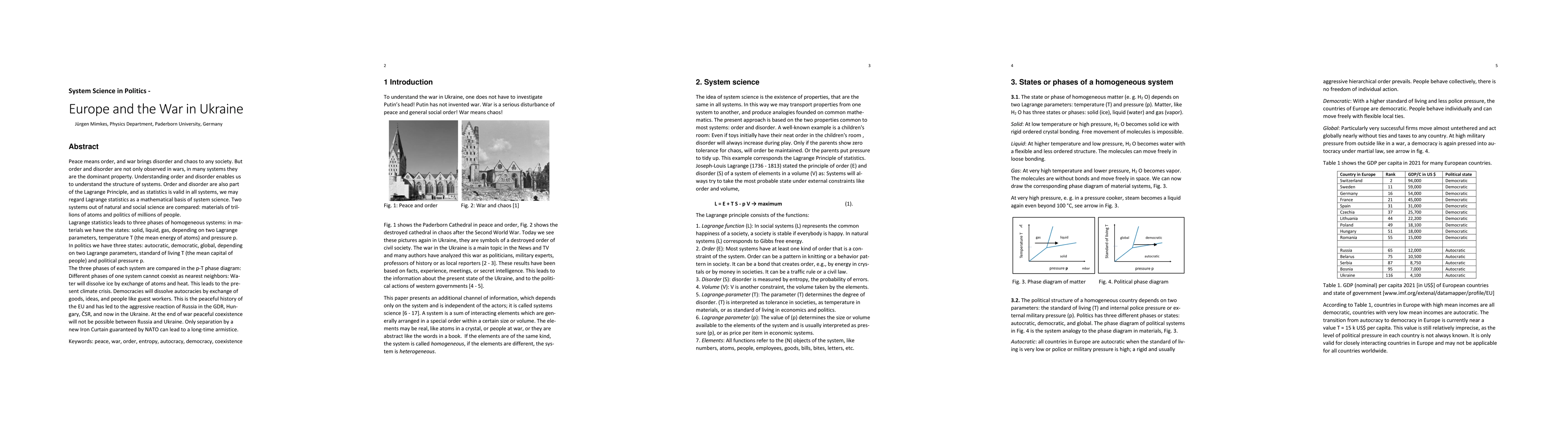 Peace means order, and war brings disorder and chaos to any society. But order and disorder are not only observed in wars, in many systems they are the dominant property. Understanding order and disorder enables us to understand the structure of systems. Order and disorder are also part of the Lagrange Principle, and as statistics is valid in all systems, we may regard Lagrange statistics as a mathematical basis of system science. Two systems out of natural and social science are compared: materials of trillions of atoms and politics of millions of people. Lagrange statistics leads to three phases of homogeneous systems: in materials we have the states: solid, liquid, gas, depending on two Lagrange parameters, temperature T (the mean energy of atoms) and pressure p. In politics we have three states: autocratic, democratic, global, depending on two Lagrange parameters, standard of living T (the mean capital of people) and political pressure p. The three phases of each system are compared in the p-T phase diagram: Different phases of one system cannot coexist as nearest neighbors: Water will dissolve ice by exchange of atoms and heat. This leads to the present climate crisis. Democracies will dissolve autocracies by exchange of goods, ideas, and people like guest workers. This is the peaceful history of the EU and has led to the aggressive reaction of Russia in the GDR, Hungary, \v{C}SR, and now in the Ukraine. At the end of war peaceful coexistence will not be possible between Russia and Ukraine. Only separation by a new Iron Curtain guaranteed by NATO can lead to a long-time armistice.