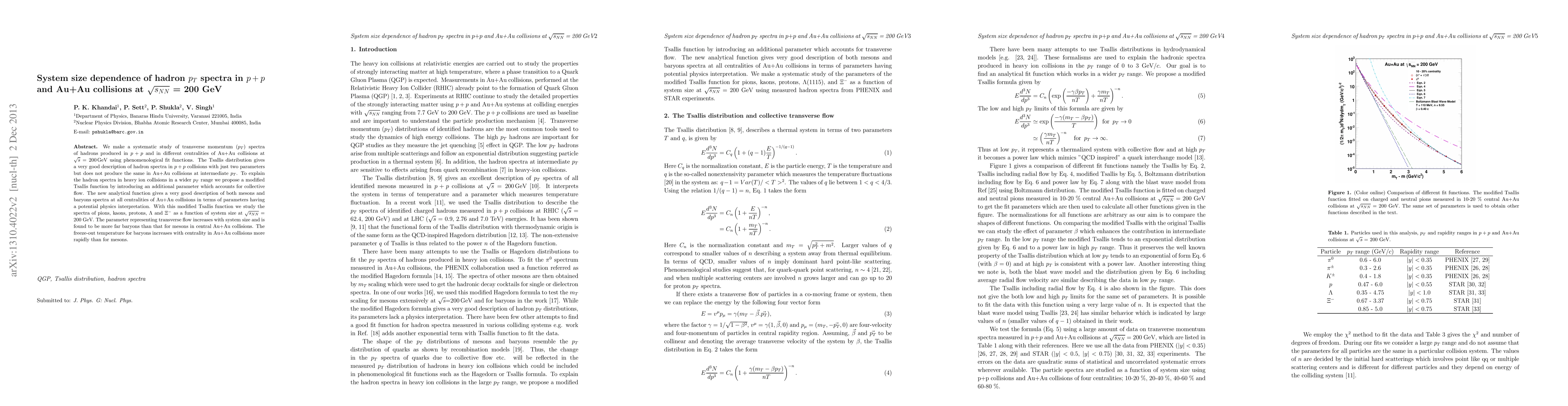 We make a systematic study of transverse momentum ($p_T$) spectra of hadrons produced in $p+p$ and in different centralities of Au+Au collisions at $\sqrt{s}=200$\,GeV using phenomenological fit functions. The Tsallis distribution gives a very good description of hadron spectra in $p+p$ collisions with just two parameters but does not produce the same in Au+Au collisions at intermediate $p_{T}$. To explain the hadron spectra in heavy ion collisions in a wider $p_{T}$ range we propose a modified Tsallis function by introducing an additional parameter which accounts for collective flow. The new analytical function gives a very good description of both mesons and baryons spectra at all centralities of Au+Au collisions in terms of parameters having a potential physics interpretation. With this modified Tsallis function we study the spectra of pions, kaons, protons, $\Lambda(1115)$ and $\Xi^{-}$ as a function of system size at $\sqrt{s_{NN}}$ = 200 GeV. The parameter representing transverse flow increases with system size and is found to be more far baryons than that for mesons in central Au+Au collisions. The freeze-out temperature for baryons increases with centrality in Au+Au collisions more rapidly than for mesons.