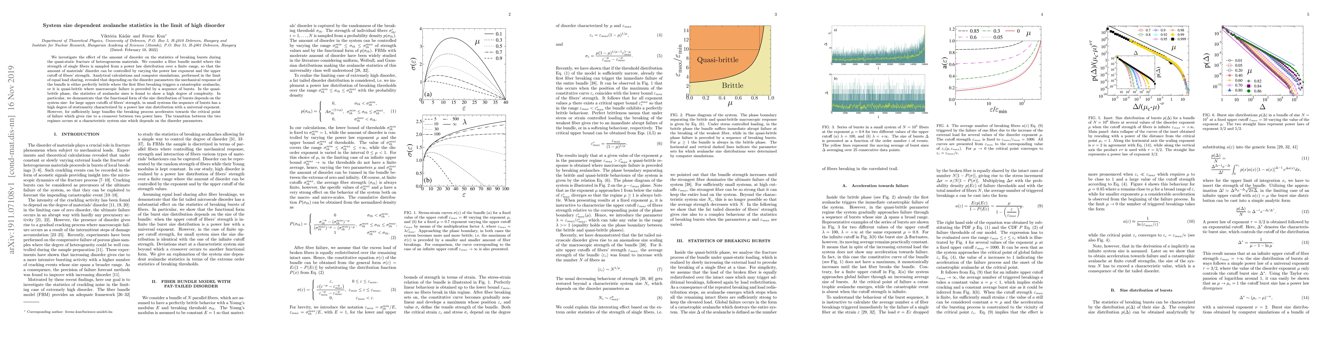 This study examines how varying levels of disorder in a fiber bundle model affect the statistical properties of breaking bursts during fracture. The research finds that the mechanical response shifts from perfectly brittle to quasi-brittle, with the size distribution of bursts showing a system-size-dependent crossover between two power laws, revealing a complex statistical behavior.