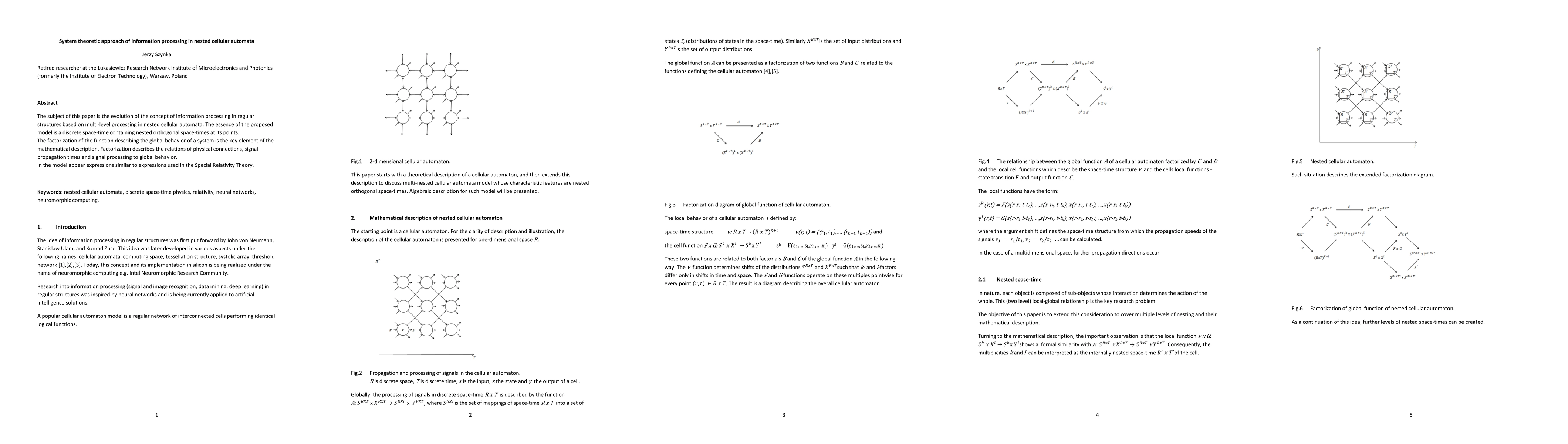 The subject of this paper is the evolution of the concept of information processing in regular structures based on multi-level processing in nested cellular automata. The essence of the proposed model is a discrete space-time containing nested orthogonal space-times at its points. The factorization of the function describing the global behavior of a system is the key element of the mathematical description. Factorization describes the relations of physical connections, signal propagation times and signal processing to global behavior. In the model appear expressions similar to expressions used in the Special Relativity Theory.