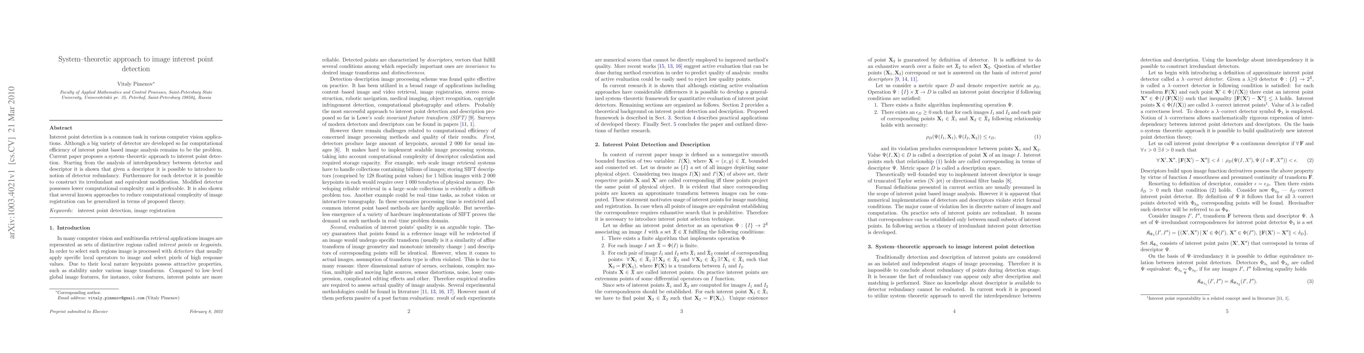 This paper proposes a system-theoretic approach to improve the computational efficiency of image interest point detection. It introduces the concept of detector redundancy and constructs irredundant modifications of detectors, resulting in lower computational complexity and better performance.