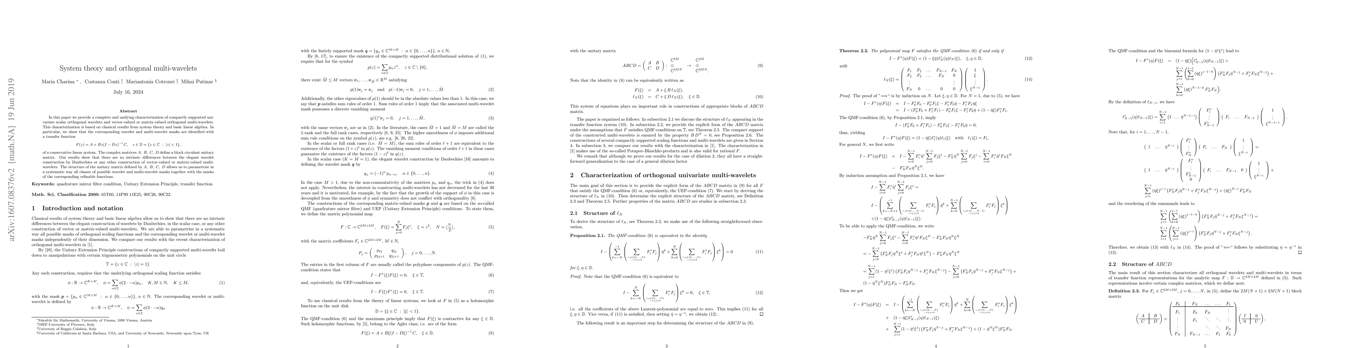 Researchers provide a unified characterization of orthogonal wavelets and multi-wavelets using system theory, showing that wavelet masks can be represented as transfer functions of conservative linear systems, providing a systematic way to parametrize all classes of possible wavelet and multi-wavelet masks.