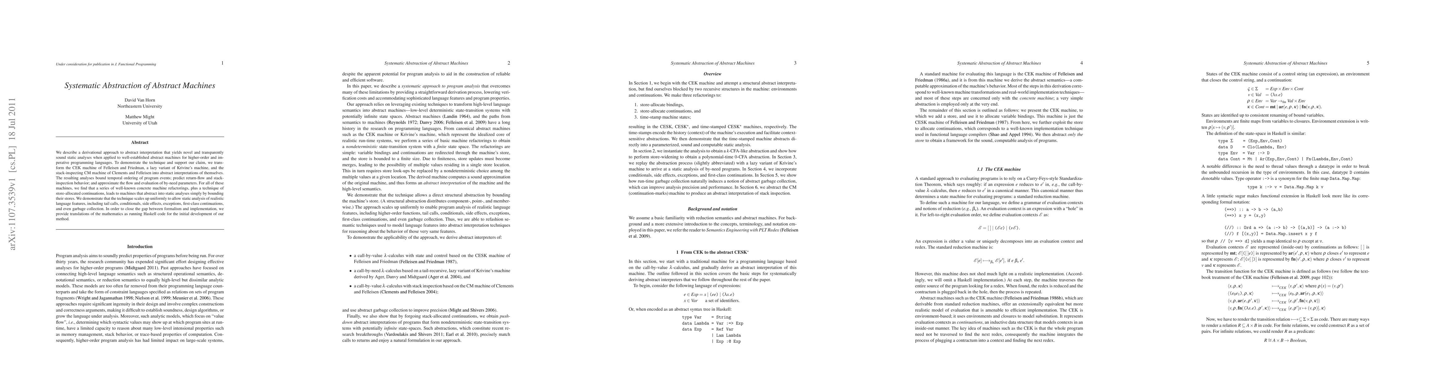 This paper presents a systematic abstraction technique for deriving sound static analyses from well-known abstract machines, demonstrating its application to the CEK, Krivine, and CM machines. The method scales to handle complex language features and is supported by Haskell code translations.