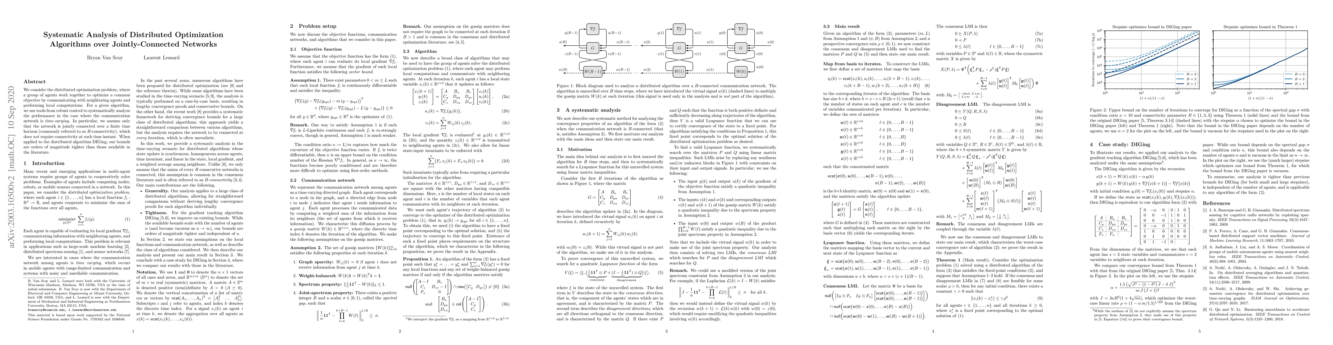 We consider the distributed optimization problem, where a group of agents work together to optimize a common objective by communicating with neighboring agents and performing local computations. For a given algorithm, we use tools from robust control to systematically analyze the performance in the case where the communication network is time-varying. In particular, we assume only that the network is jointly connected over a finite time horizon (commonly referred to as B-connectivity), which does not require connectivity at each time instant. When applied to the distributed algorithm DIGing, our bounds are orders of magnitude tighter than those available in the literature.