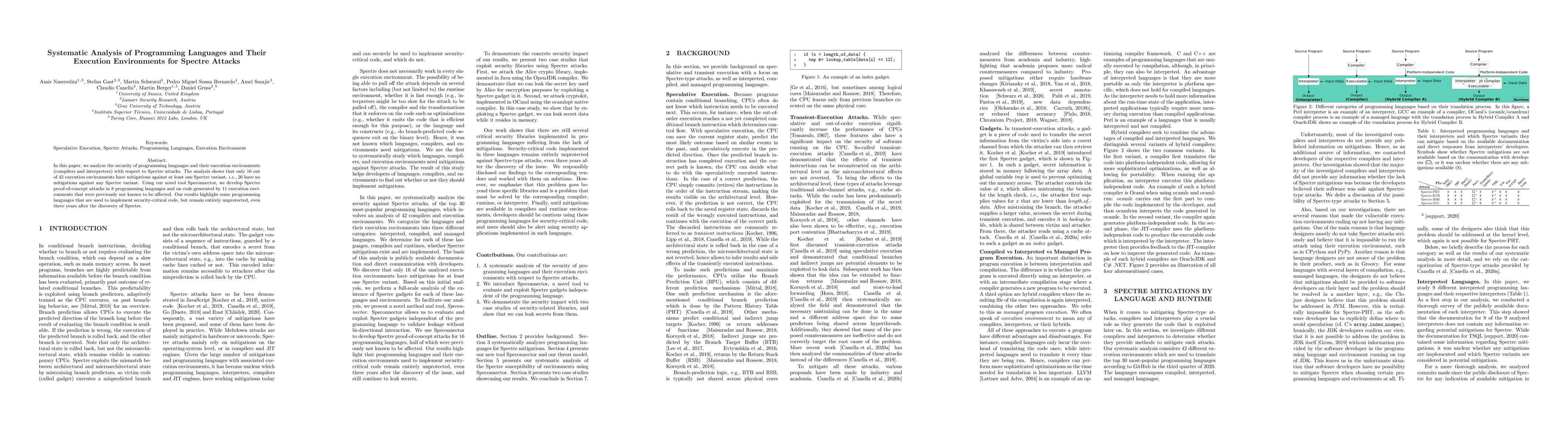 This paper systematically evaluates programming languages and their execution environments for vulnerabilities to Spectre attacks, revealing that only 16 out of 42 environments have any mitigations. Using Speconnector, the authors demonstrate new Spectre attacks on 8 languages and 11 previously unaffected environments, underscoring the continued security risks in security-critical code implementations.